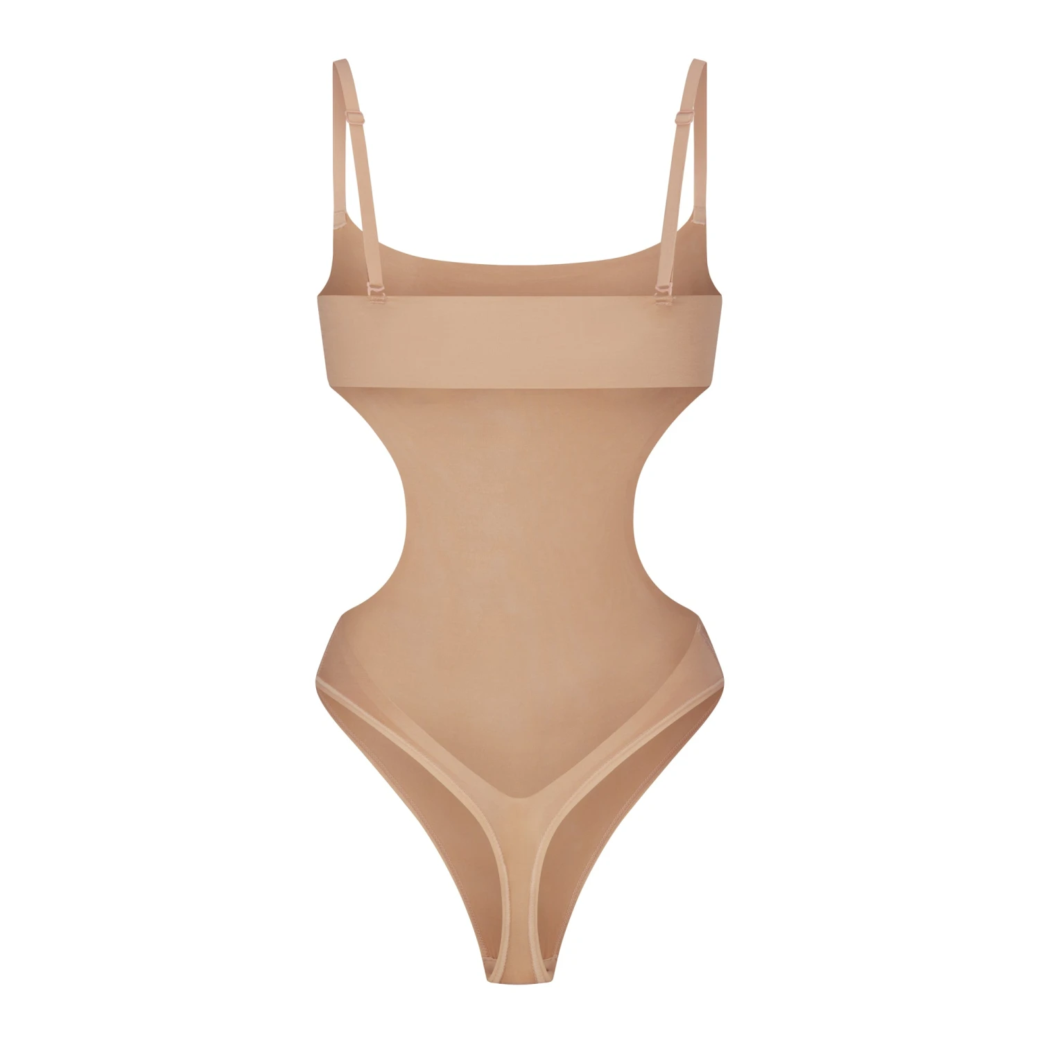 with lightly molded cups that define your bust and raw edges at the legs for a comfortable fit with no digging. Features adjustable, convertible straps for versatile wearability, large side cut-outs with bonded edges, an open low back with a smoothing back band, and a gusset with snap closure. Fits true to size.