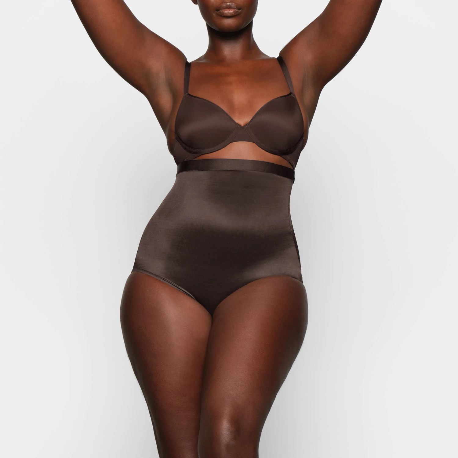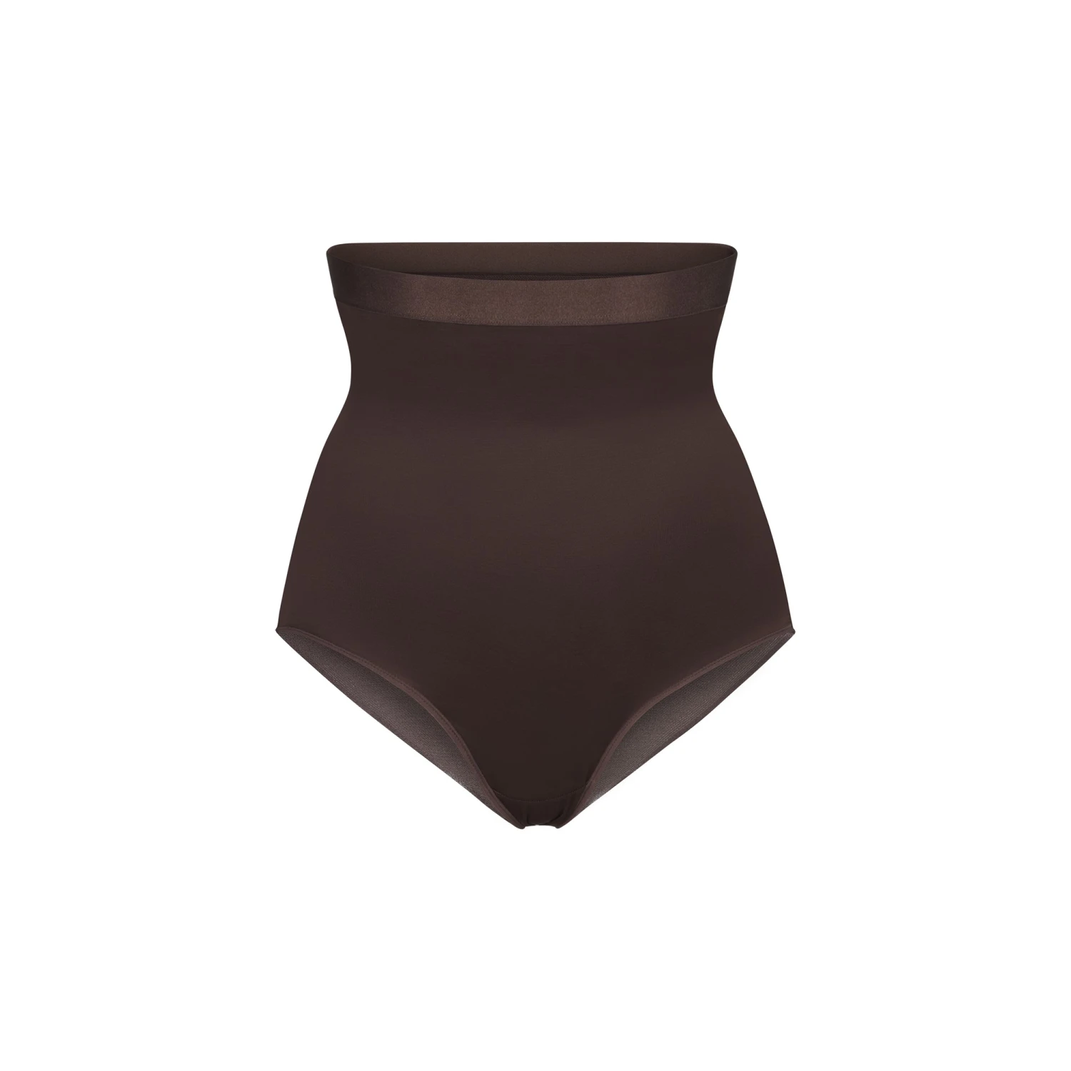 smooths and targets your hips, waist, and core. With its light compression, double lining, and elastic band, you’ll feel extra supported and held together. In between sizes? Size up for ideal fit.