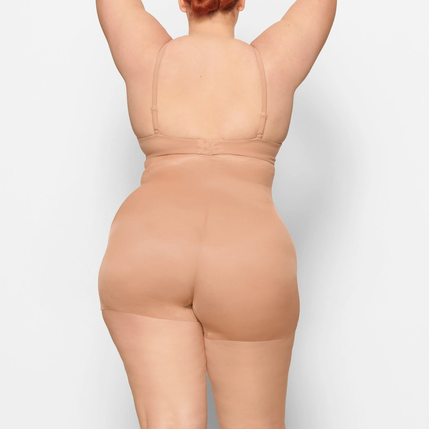 This high-waist short hits above mid-thigh to perfectly smooth your core, hips, and thighs. Features a comfortable elastic waistband, plus double-layered fabric at the mid-core for smoothing and compression. Wear with mini-length skirts and dresses for a seamless look.