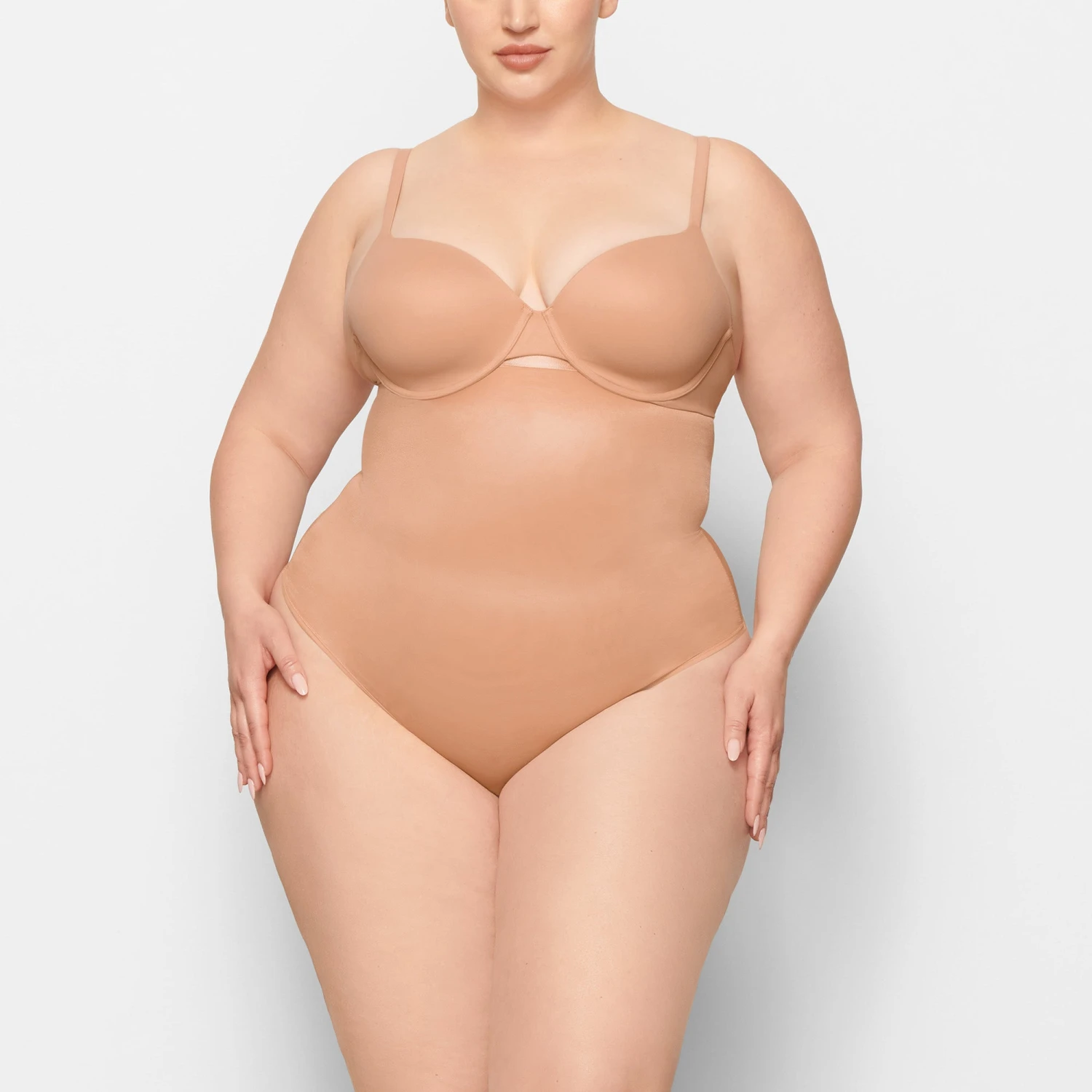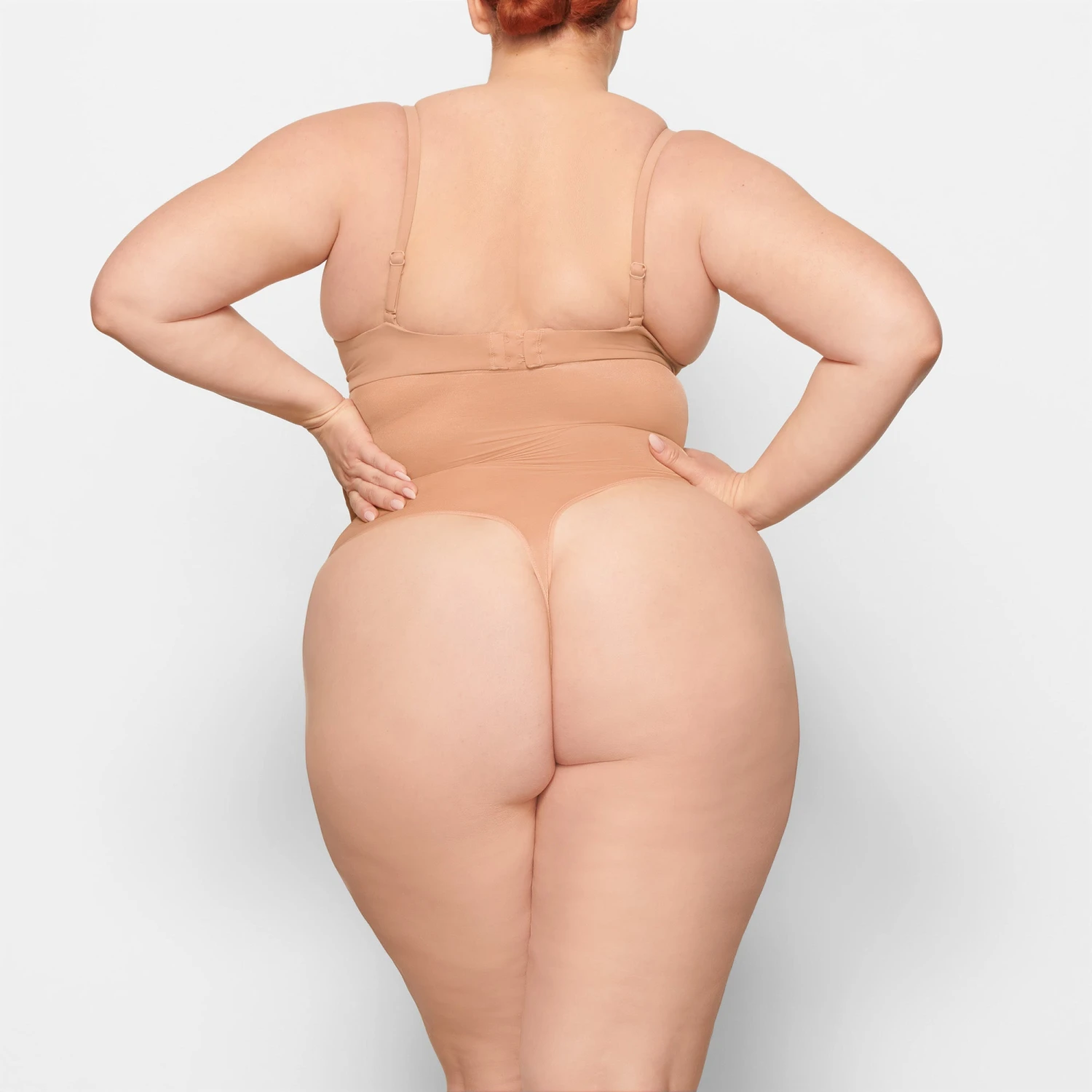 This high-waist thong smooths your core and hips while feeling like a comfortable second skin. Features a cotton gusset lining and double-layered fabric for smoothing and light compression. Wear under bottoms and dresses for a seamless look with no panty lines. Fits true to size.