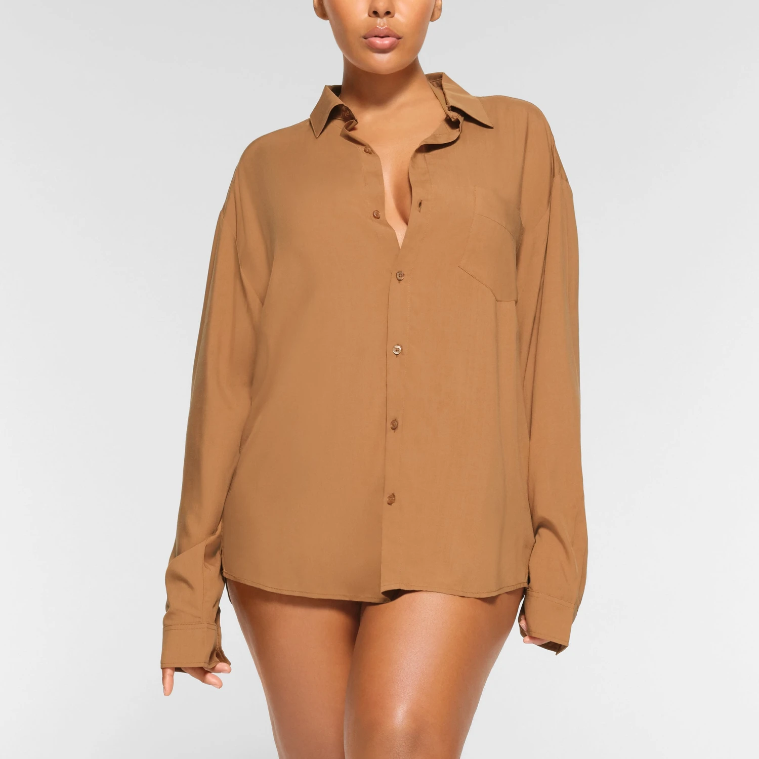 is a staple for effortless styling, to and from the beach, pool, and beyond. Features a center front button-up closure, chest patch pocket, and notch collar. True to size for an oversized fit.