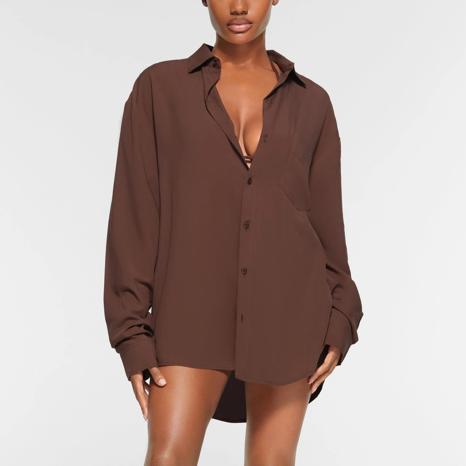 is a staple for effortless styling, to and from the beach, pool, and beyond. Features a center front button-up closure, chest patch pocket, and notch collar. True to size for an oversized fit.