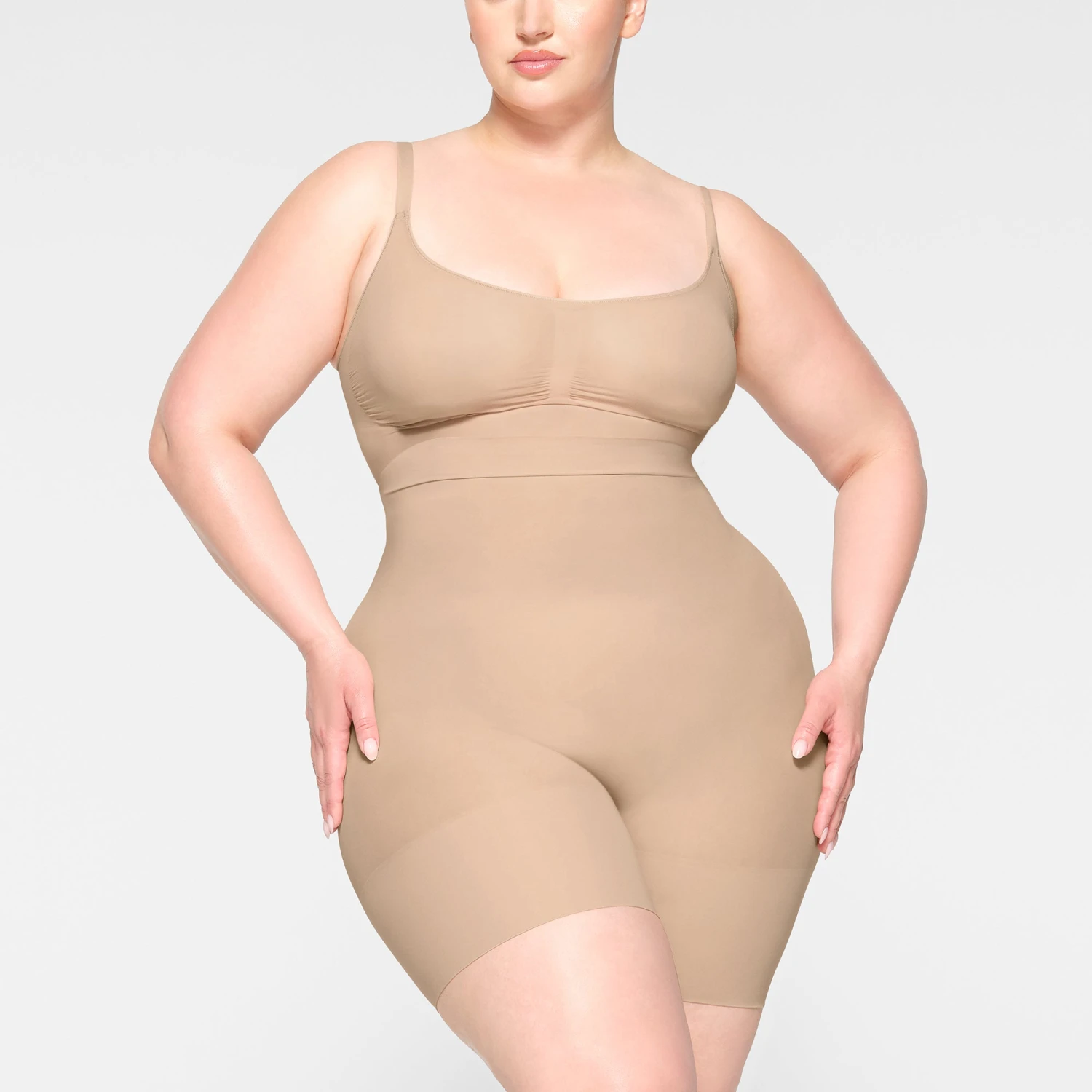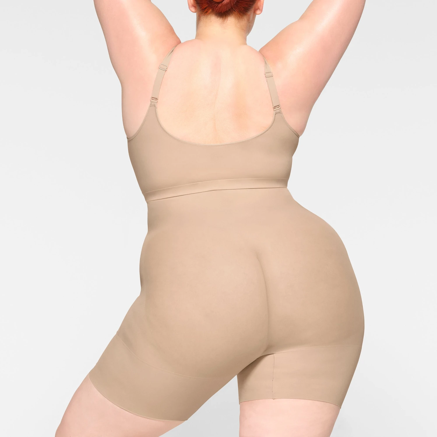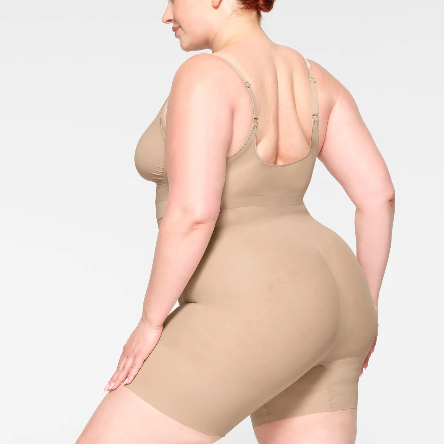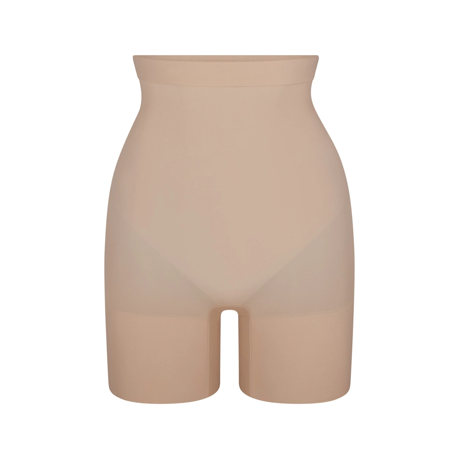 for comfortable all-day control of the tummy, waist, and thighs. Features an underband with interior silicone to prevent rolling, double-ply no-dig compression at the thighs, butt pockets that lift and define, and an open gusset. Fits true to size