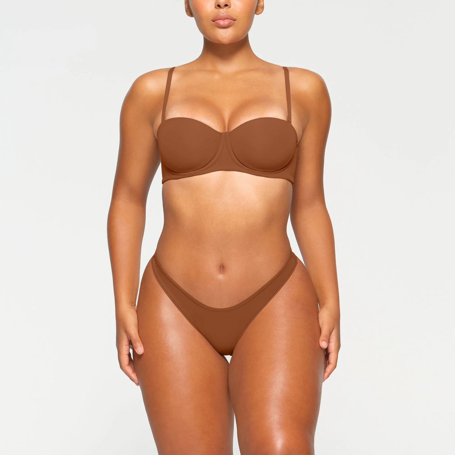 A buttery-soft strapless solution with a second-skin fit and hidden cushion underwire that supports and shapes your bust but never digs into your skin. Features removable adjustable straps that can be worn multiple ways, silicone tape along the neckline and wings to keep it in place, 2 ply wings, and a hook and eye back closure. Fits true to your