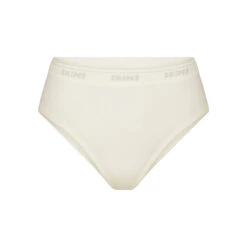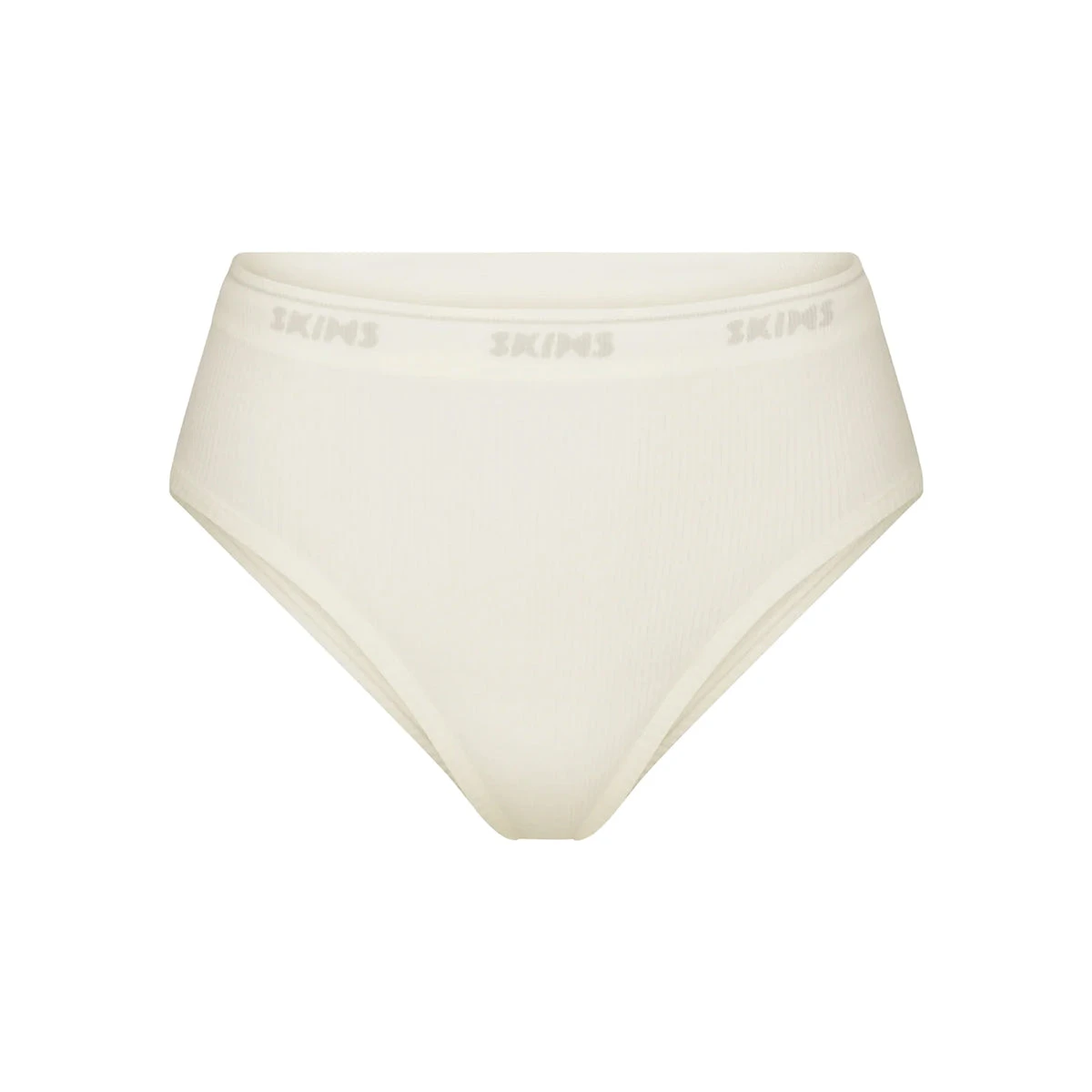 An ultra-lightweight, high leg bikini with a mid rise fit and stretchy waistband that has SKIMS logo details all over it. Features medium coverage and a cotton gusset. Make it a set with the matching Logo Rib