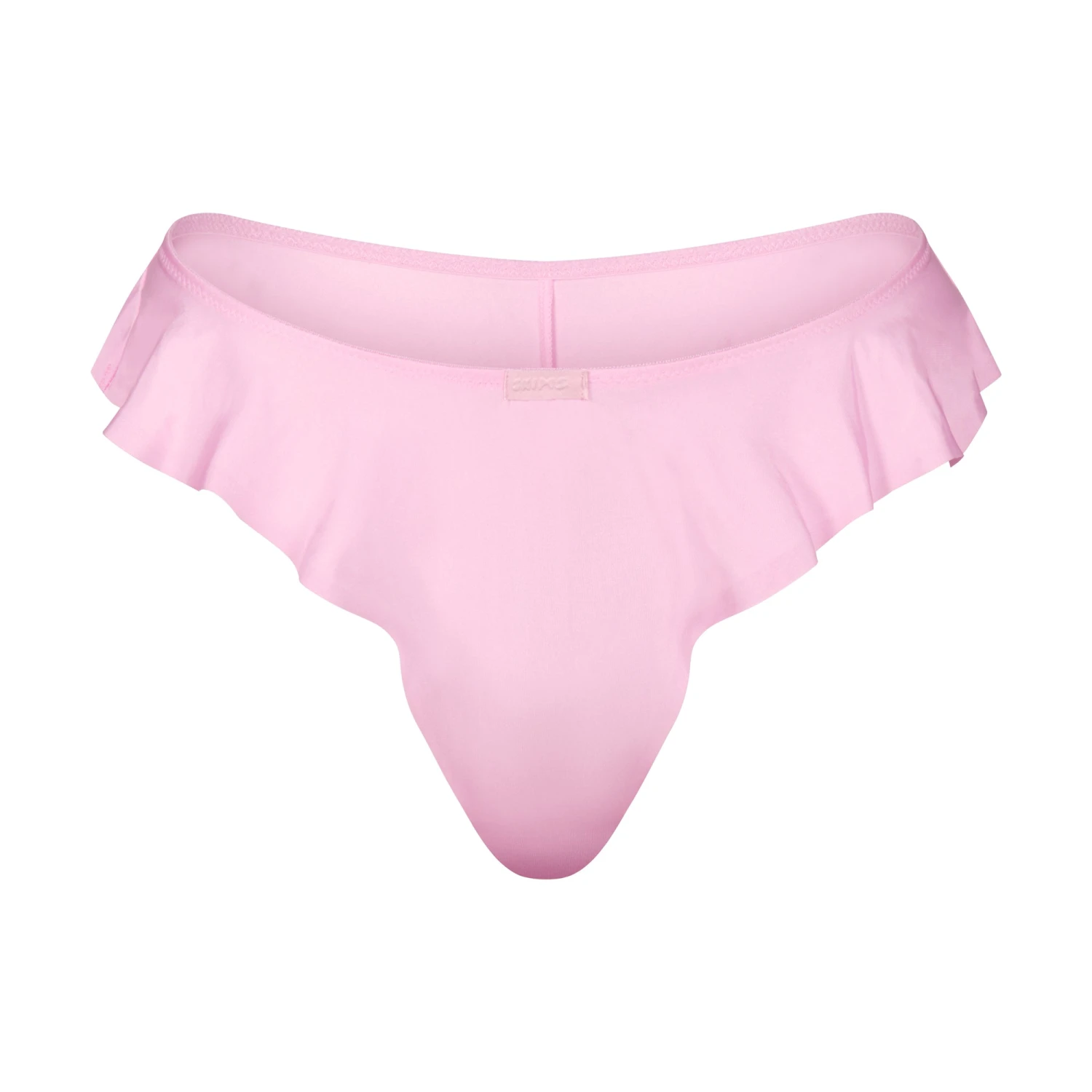 with flutter drape and trim details. Features a center front SKIMS logo, cotton gusset, and minimum back coverage. Pair it with the