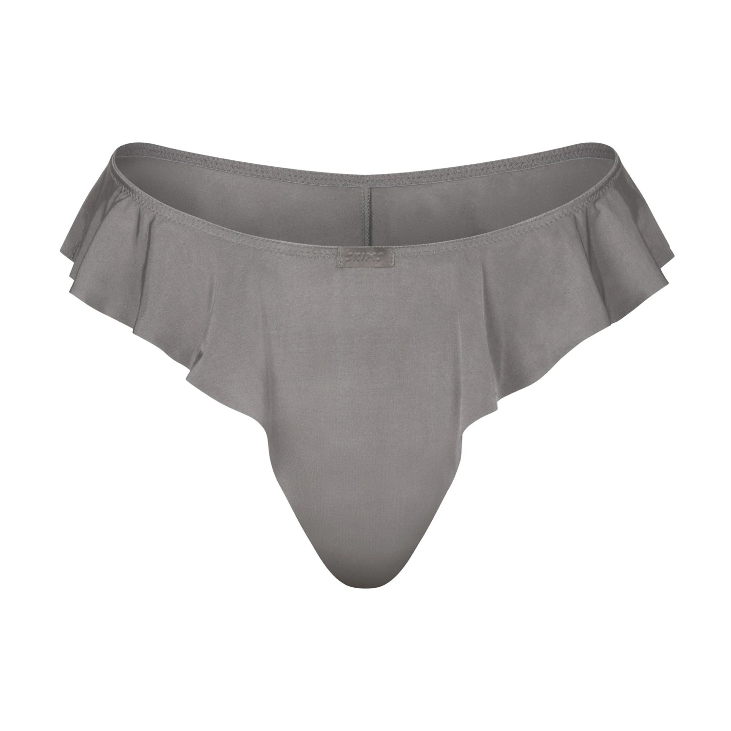 with flutter drape and trim details. Features a center front SKIMS logo, cotton gusset, and minimum back coverage. Pair it with the