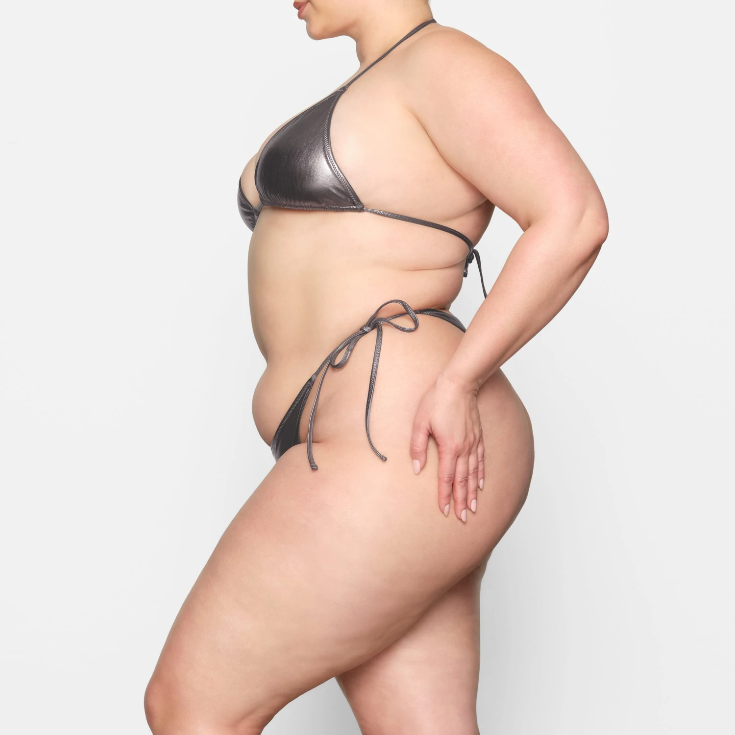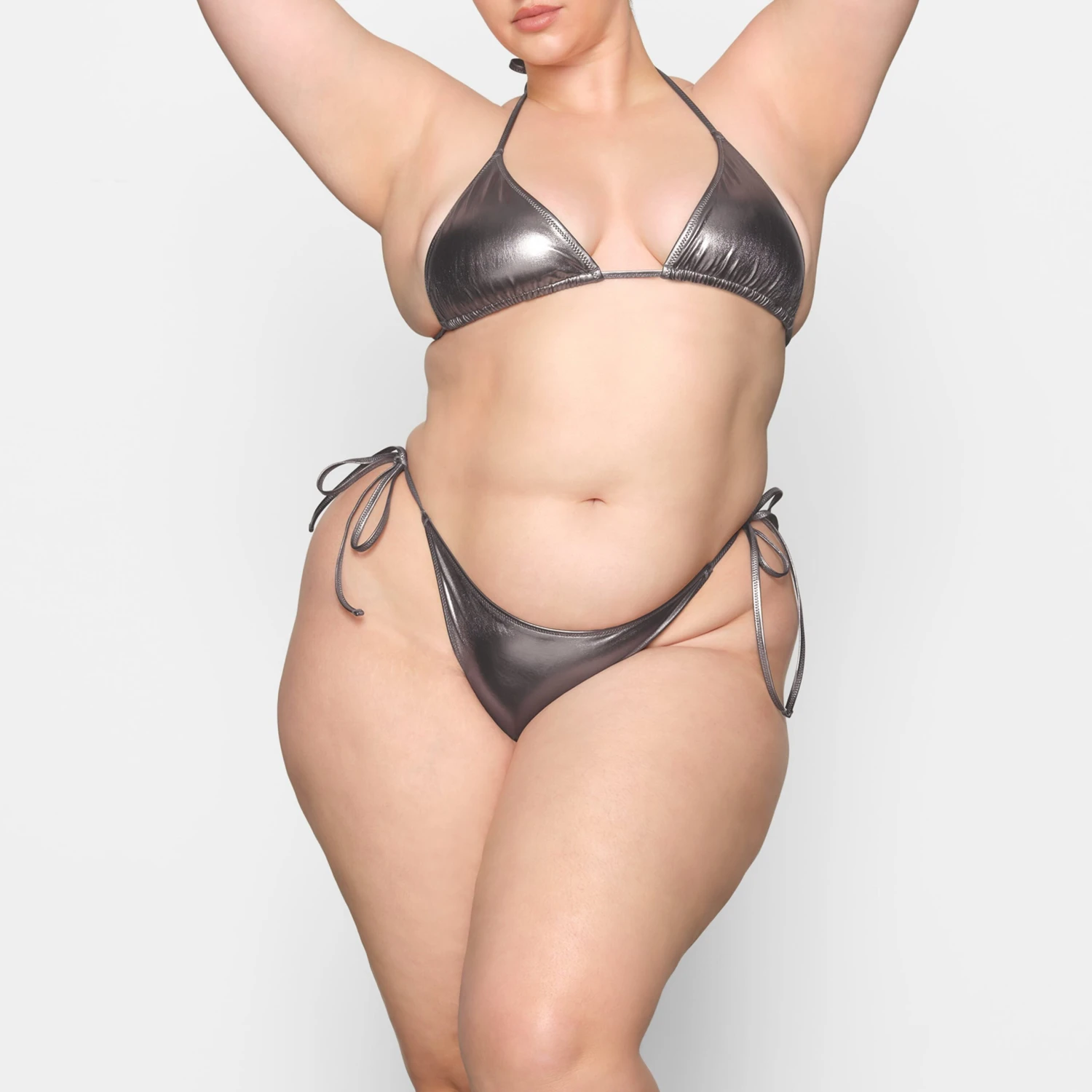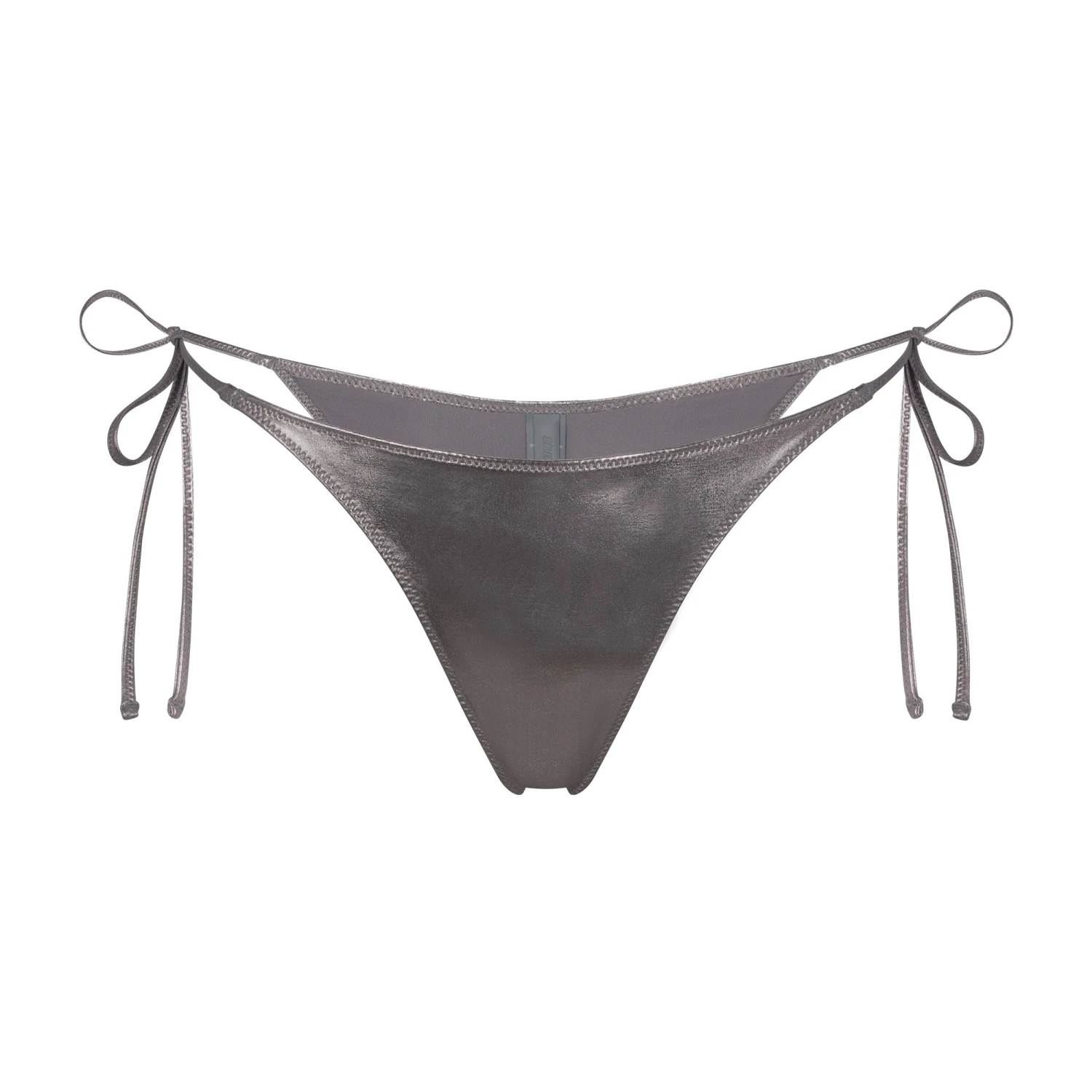 . Features skinny adjustable ties at the sides and cheeky back coverage. Complete the look with your favorite Metallic