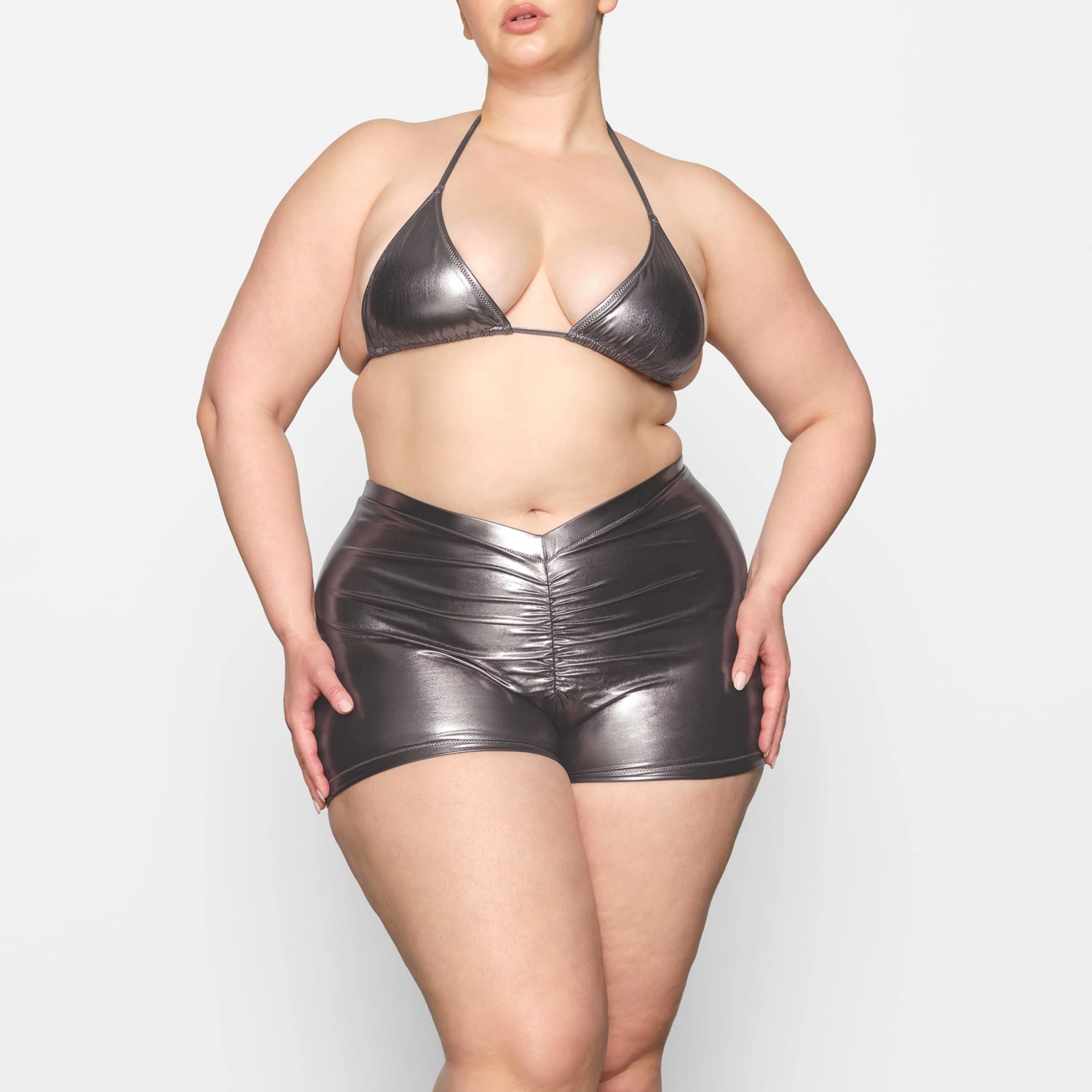 shorts, now with a dipped front waistband and back. Features a light lining and flattering ruching along the center front and back seams. Fits true to size.
