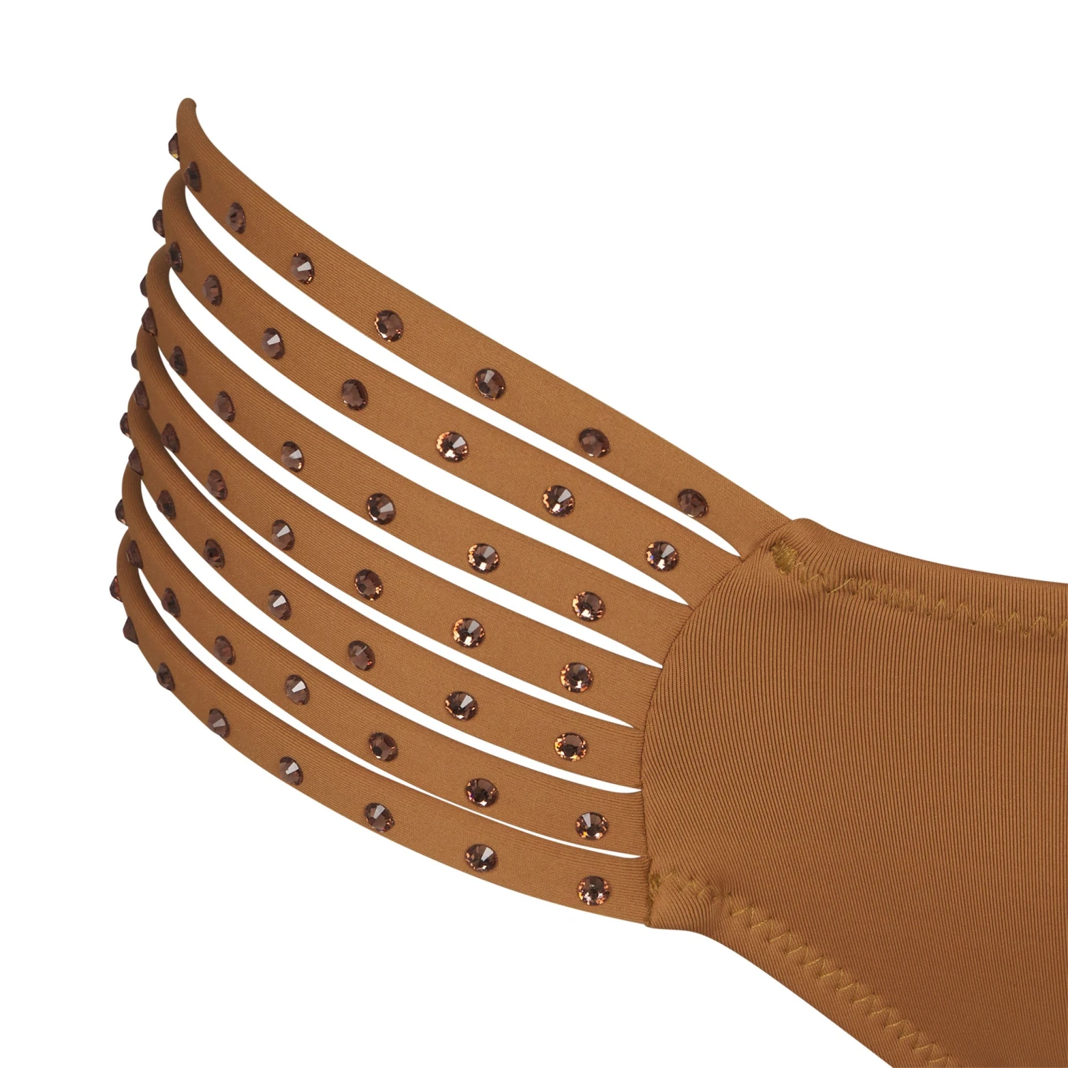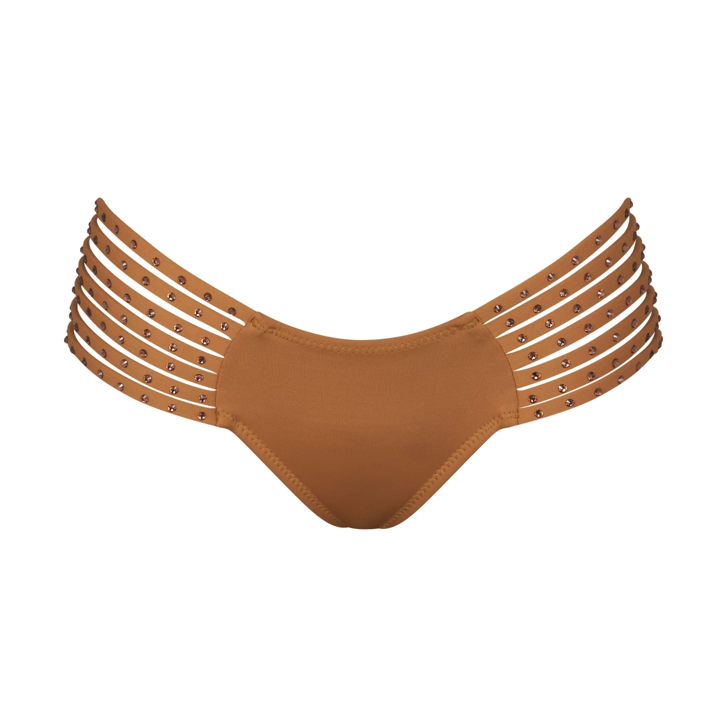 has strappy sides adorned with tonal rhinestones for a show-stopping look. Features cheeky back coverage. Make it a set with the coordinating