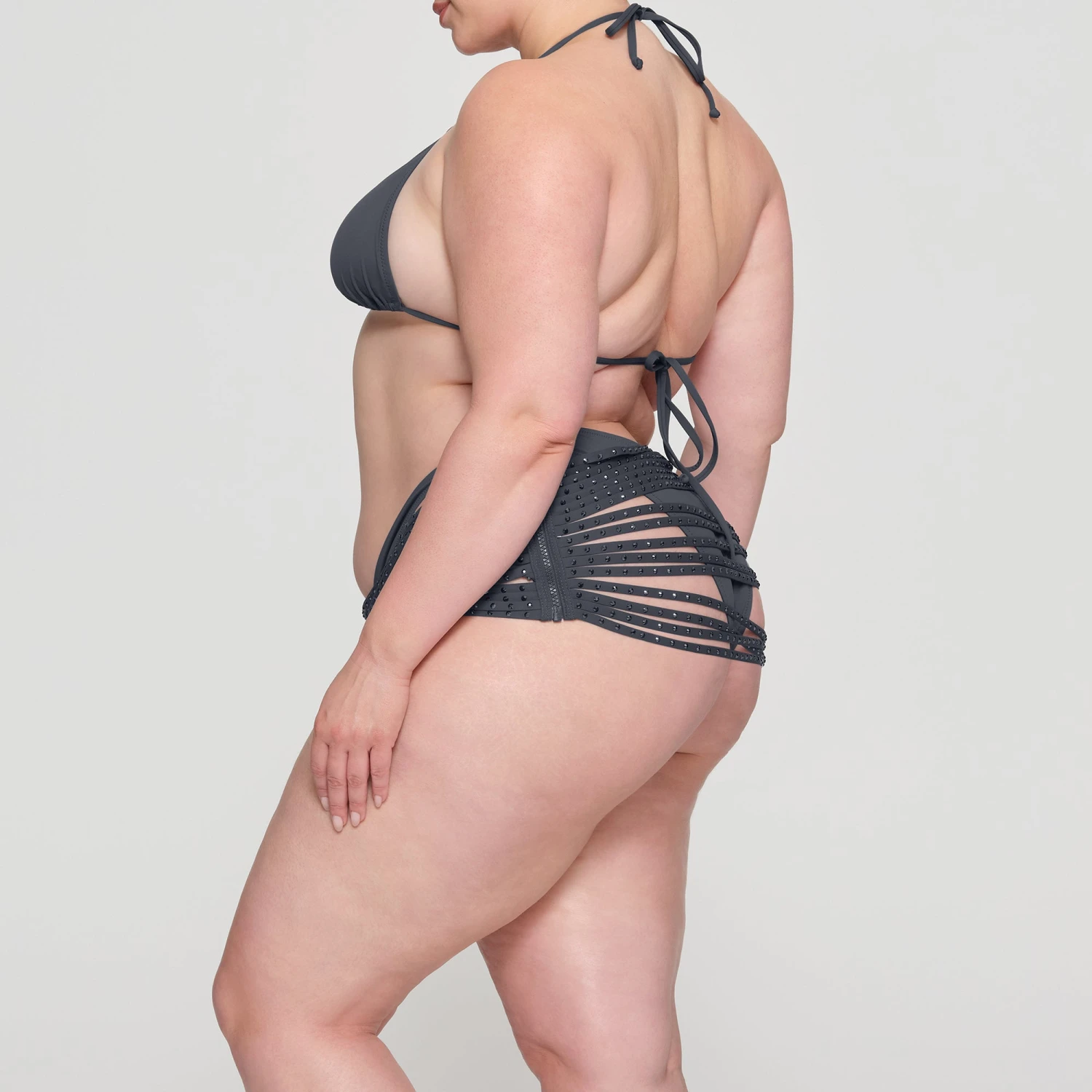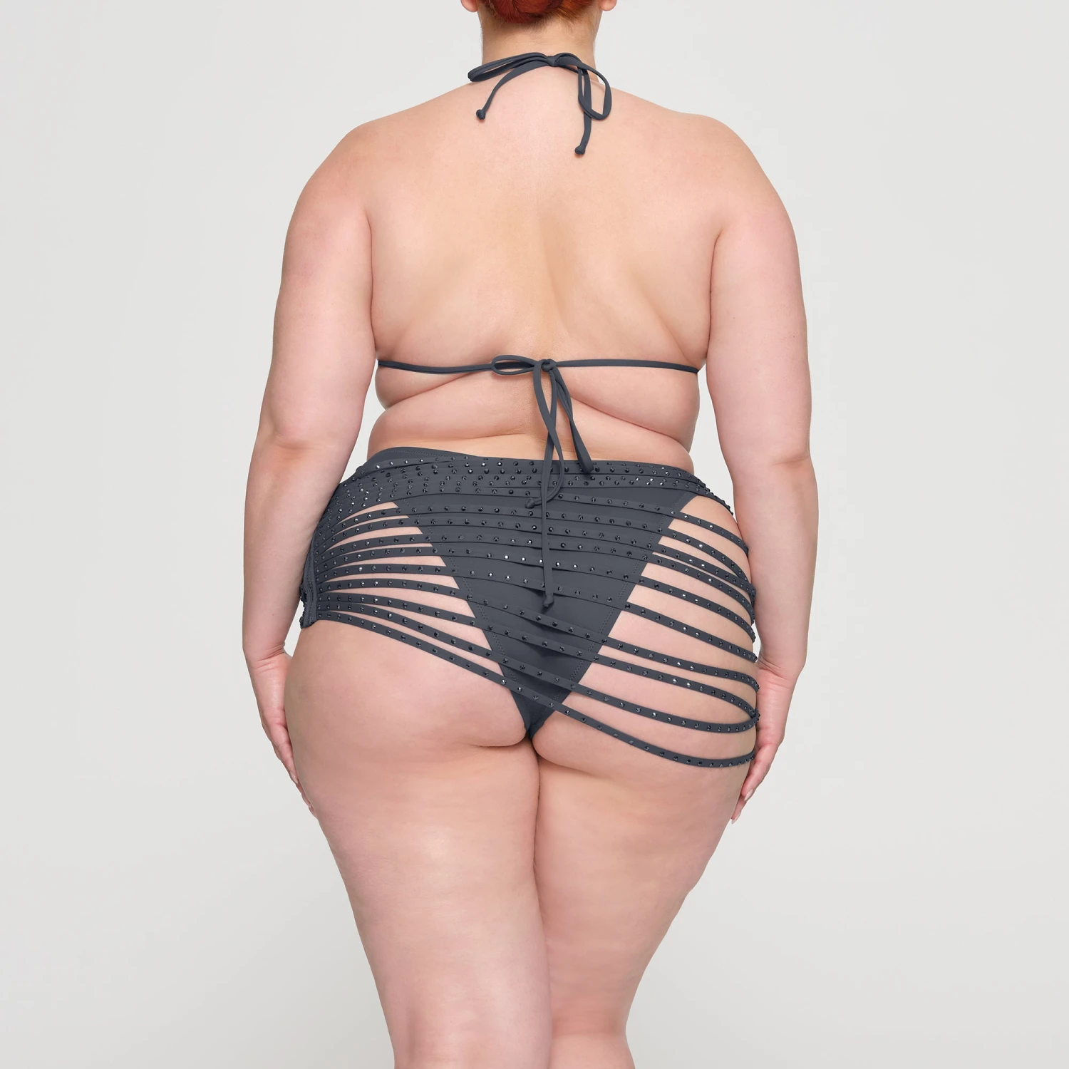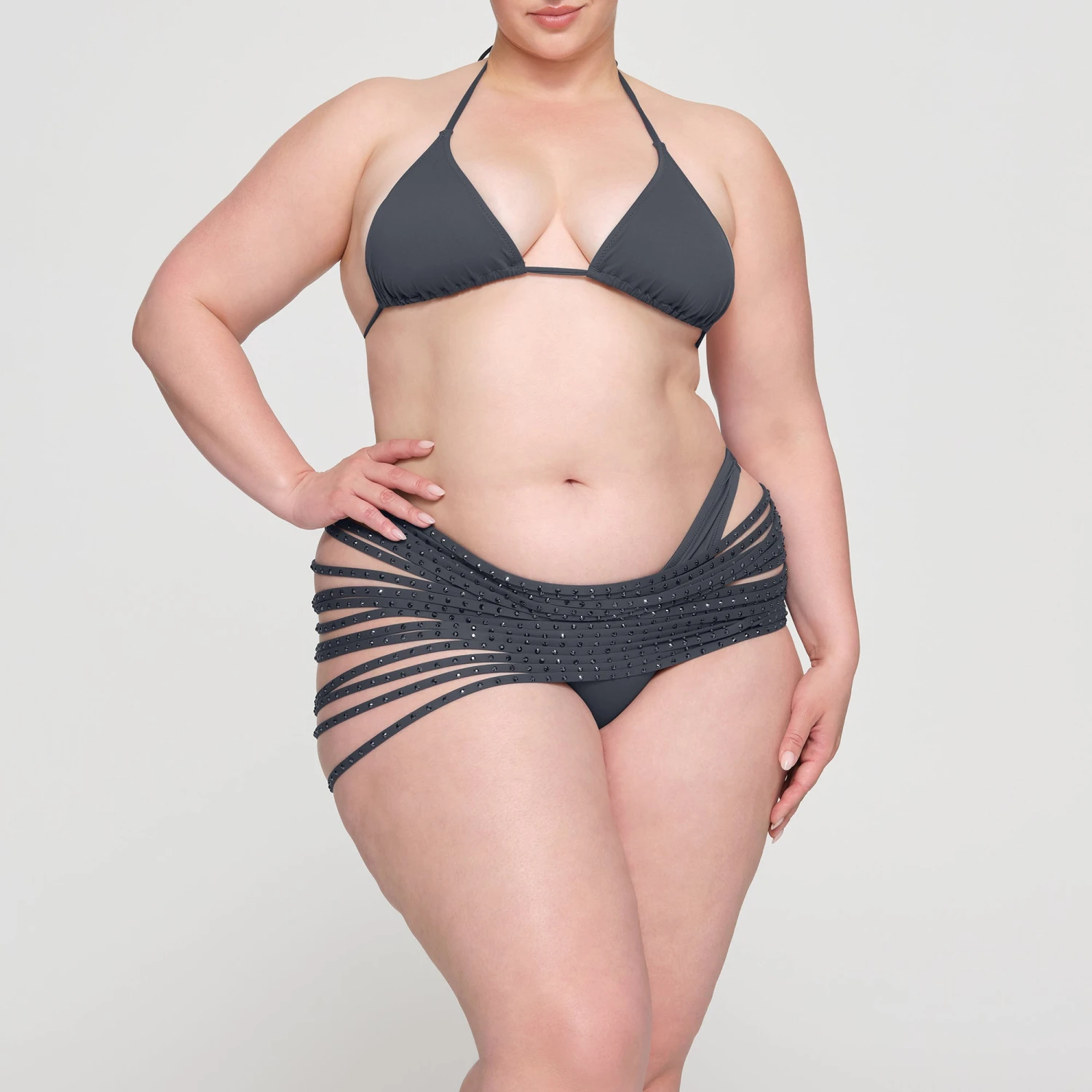 is a styling must-have for your hottest days by the water. Features tonal rhinestone details and a side zip closure. Pair with your favorite