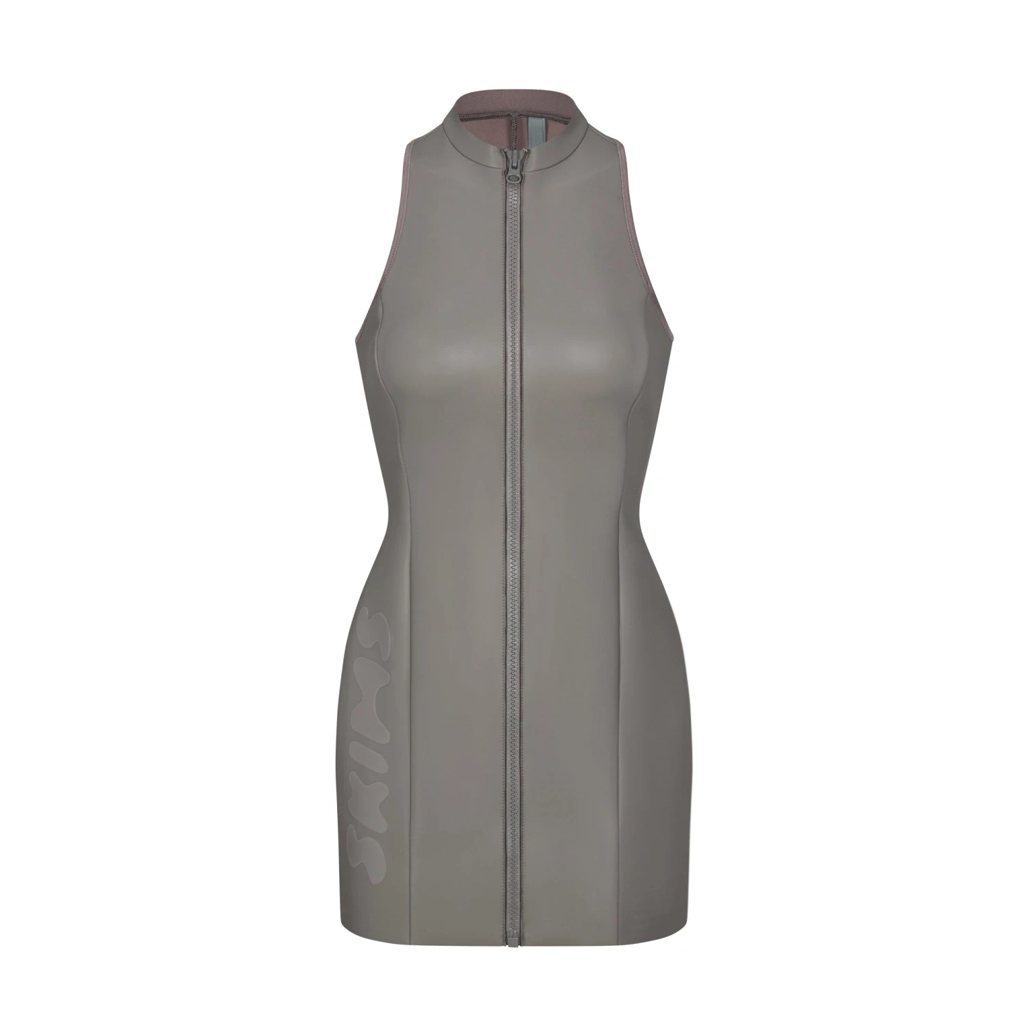 that has SKIMS logo details along the side and a curve-hugging fit. Features a center front zipper for adjustability, binding along the edges, and raw cut bottom edges. Fits true to size.