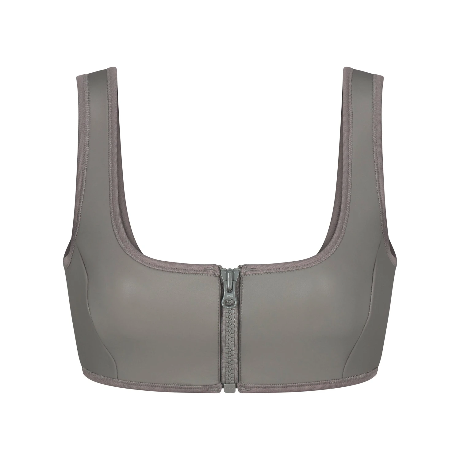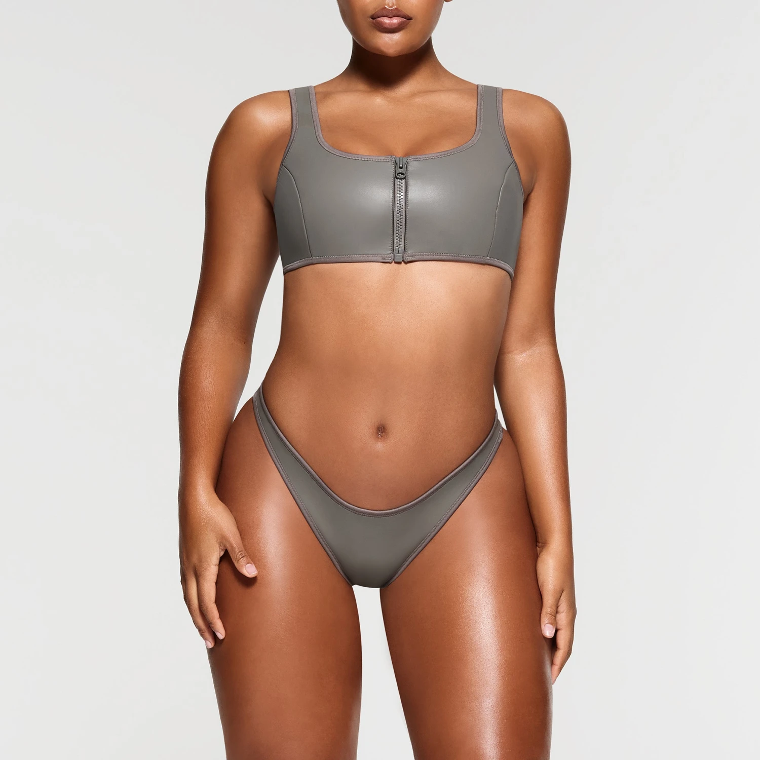 has a slick, wet look and sexy zip front closure. Features non-adjustable thick straps and seaming details. Complete the look with the coordinating ScubaÂ