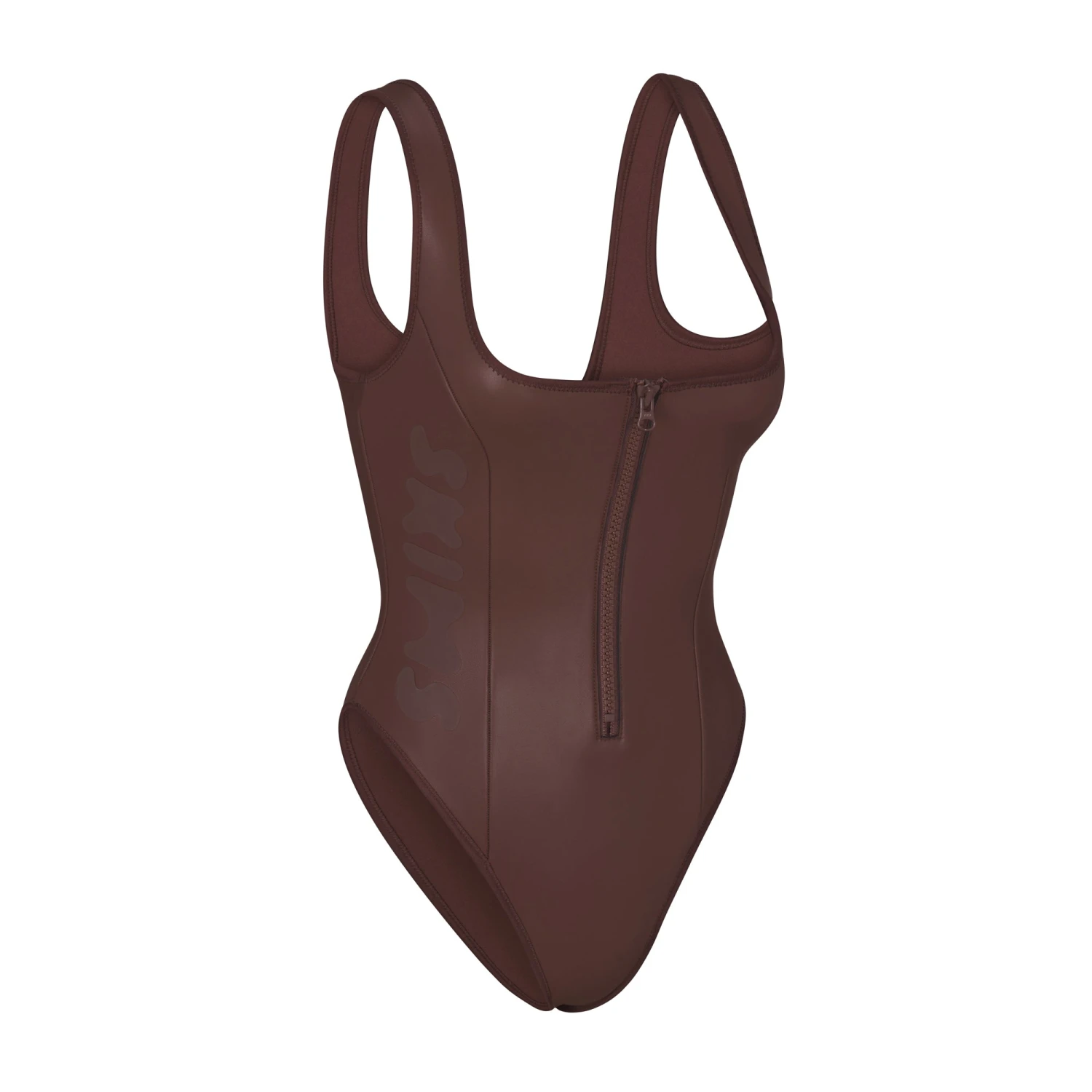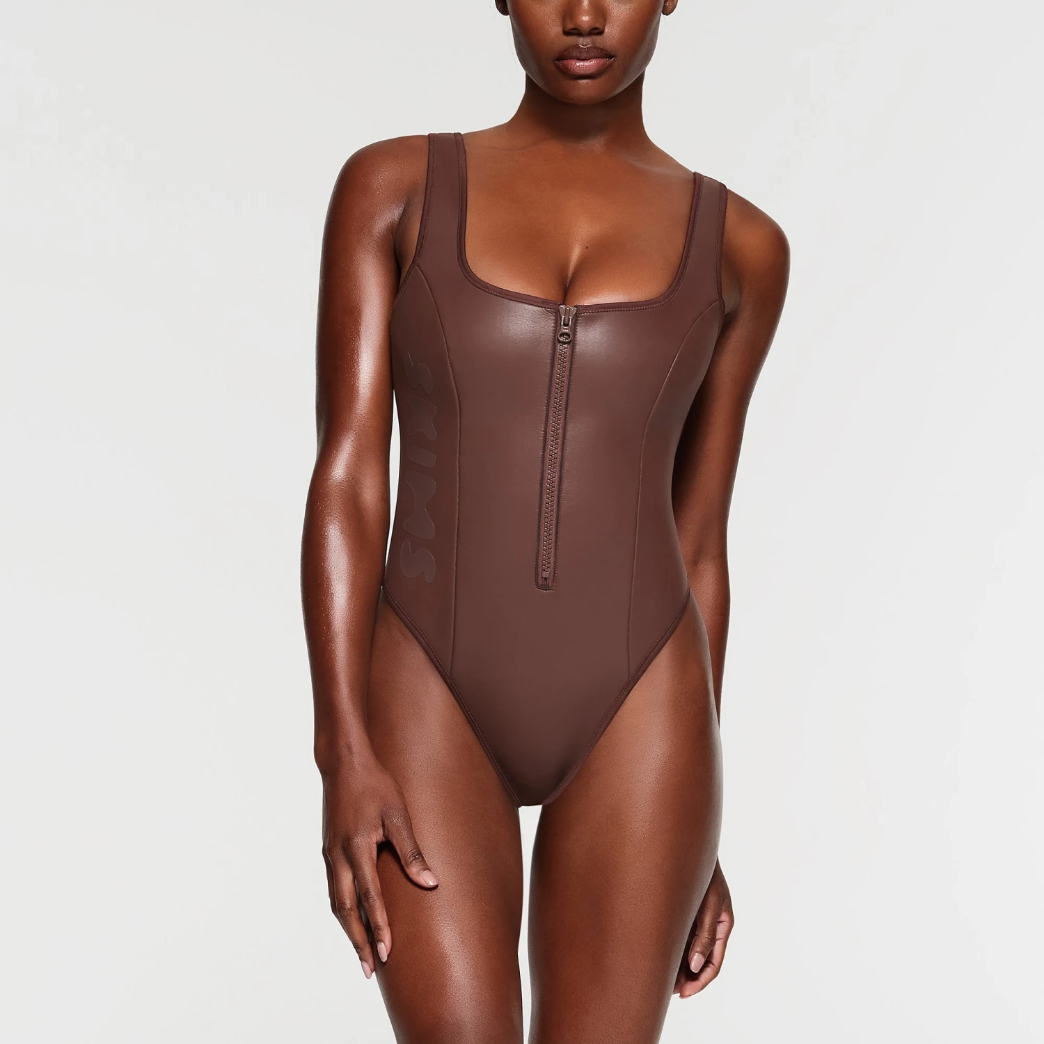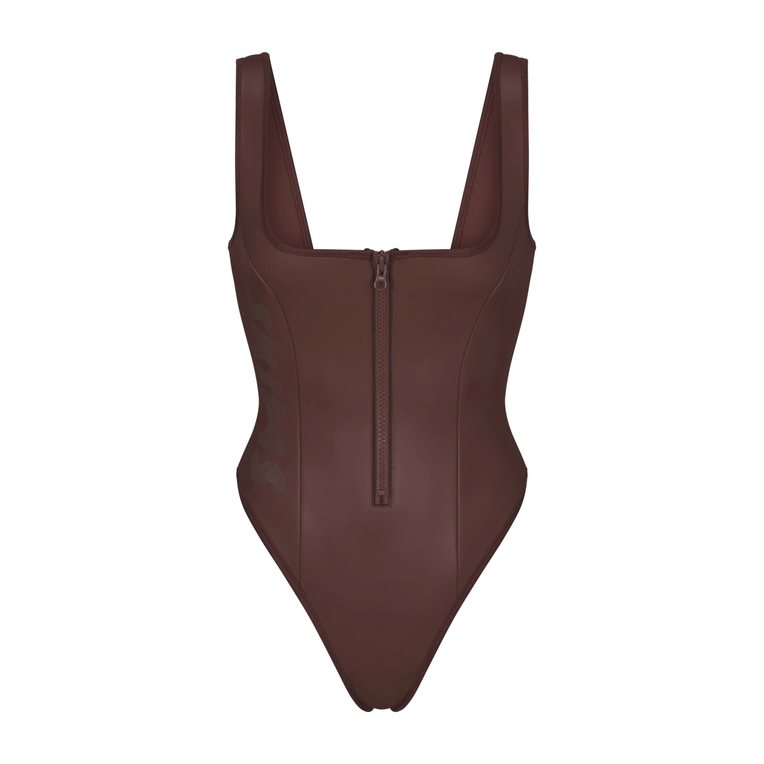 that has SKIMS logo details along the side. Features binding along the edges and a center front zipper for the coverage of your choice. Fits true to size.