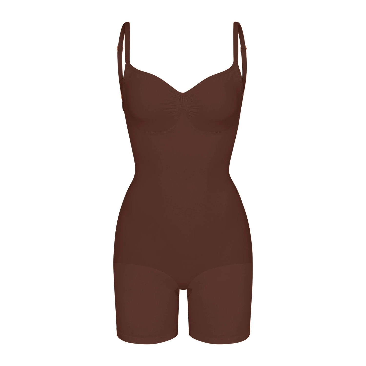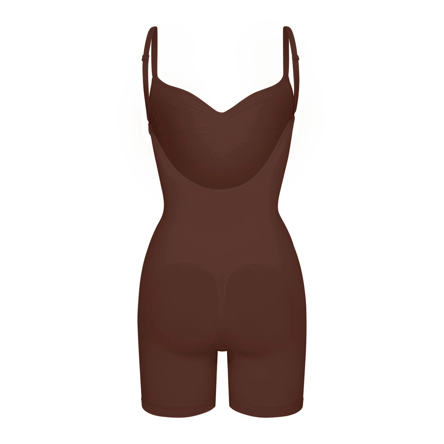 A sculpting bodysuit that sculpts silhouette, cinches waist, and smooth thighs while providing support and lift for your curves. Featuring a deep scoop back that makes it the perfect