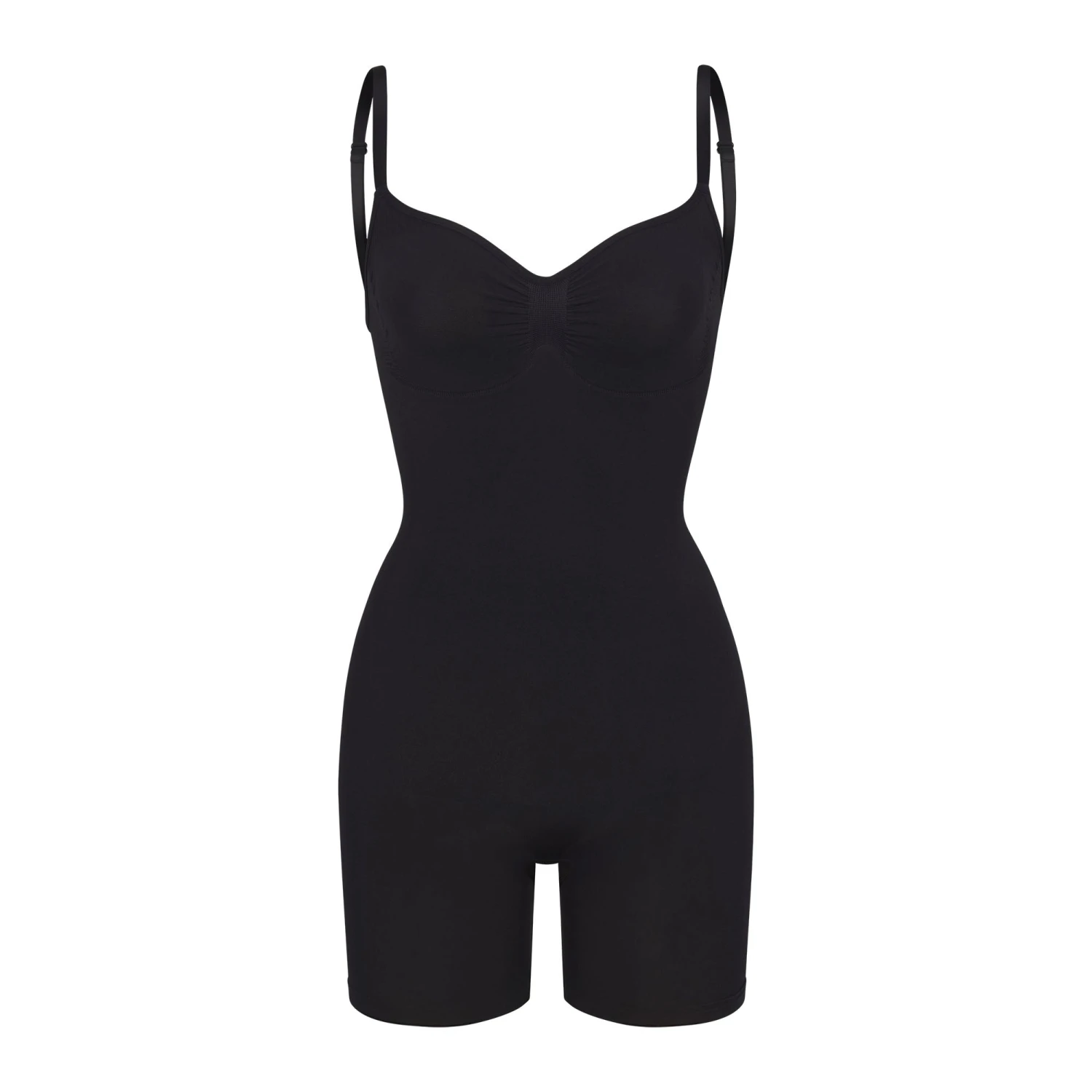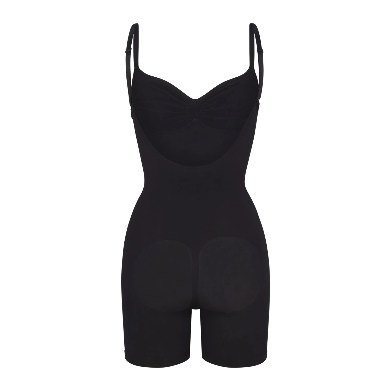 A sculpting bodysuit that sculpts silhouette, cinches waist, and smooth thighs while providing support and lift for your curves. Featuring a deep scoop back that makes it the perfect