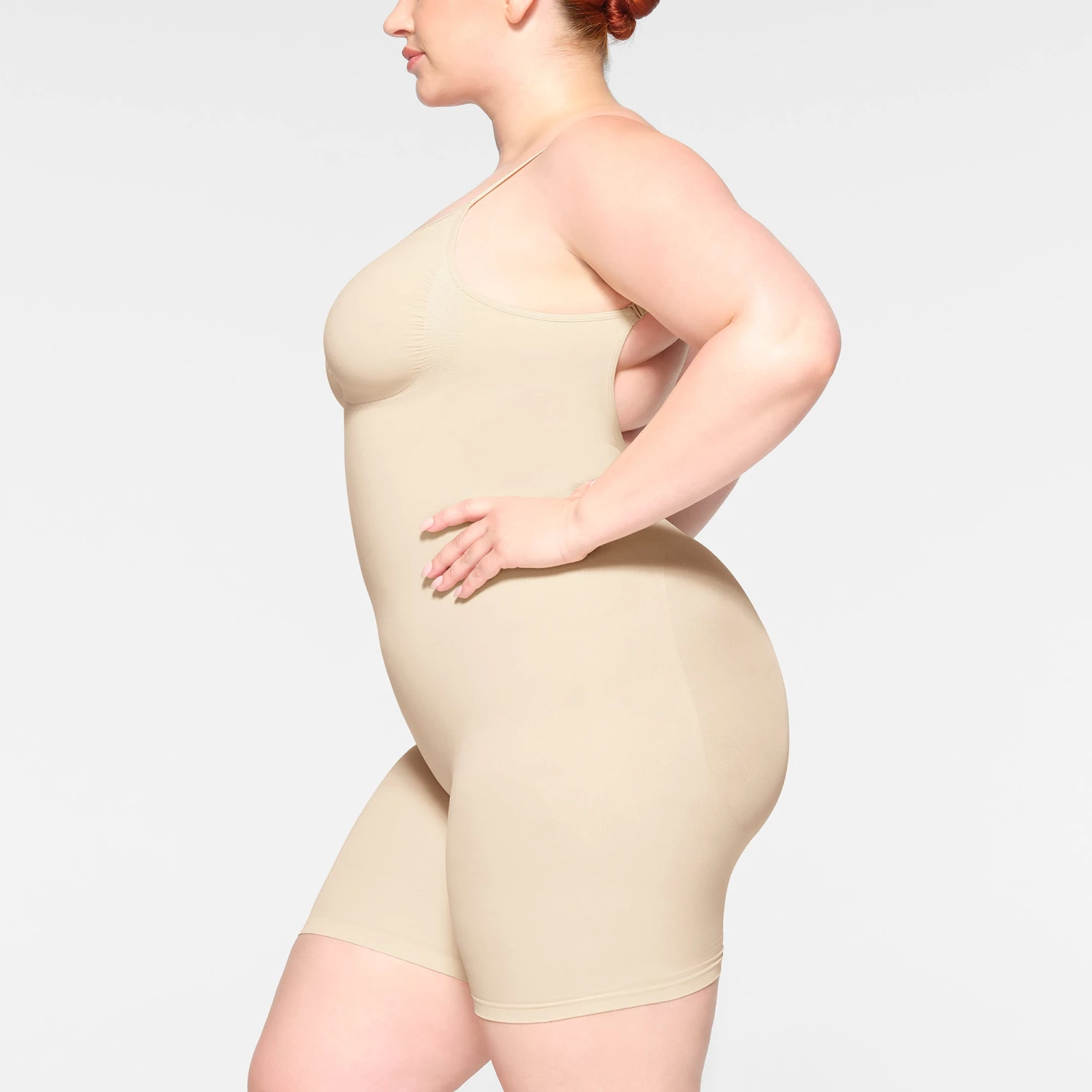 A sculpting bodysuit that sculpts silhouette, cinches waist, and smooth thighs while providing support and lift for your curves. Featuring a deep scoop back that makes it the perfect