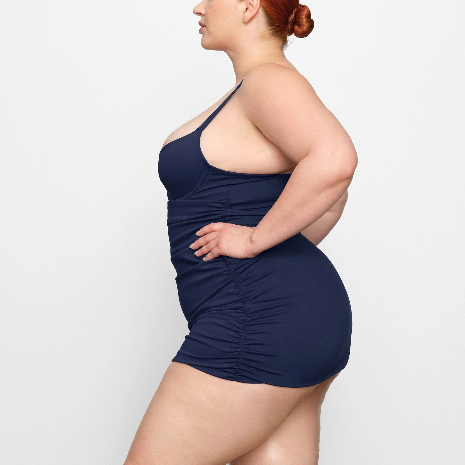 . Features flattering ruching details, a deep scoop plunge back, and thick non-adjustable straps. Fits true to size.