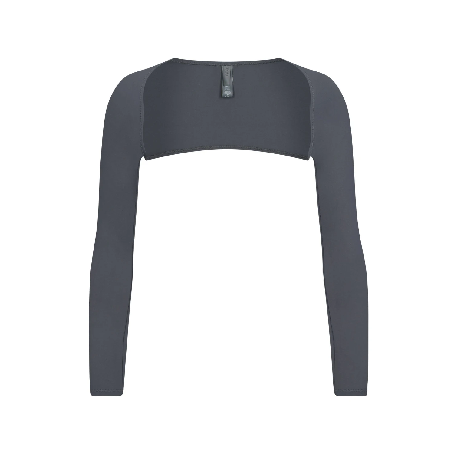 shrug that smooths your arms and adds extra coverage and sun protection. Features an open front with long sleeves. Layer over Shaping Swim