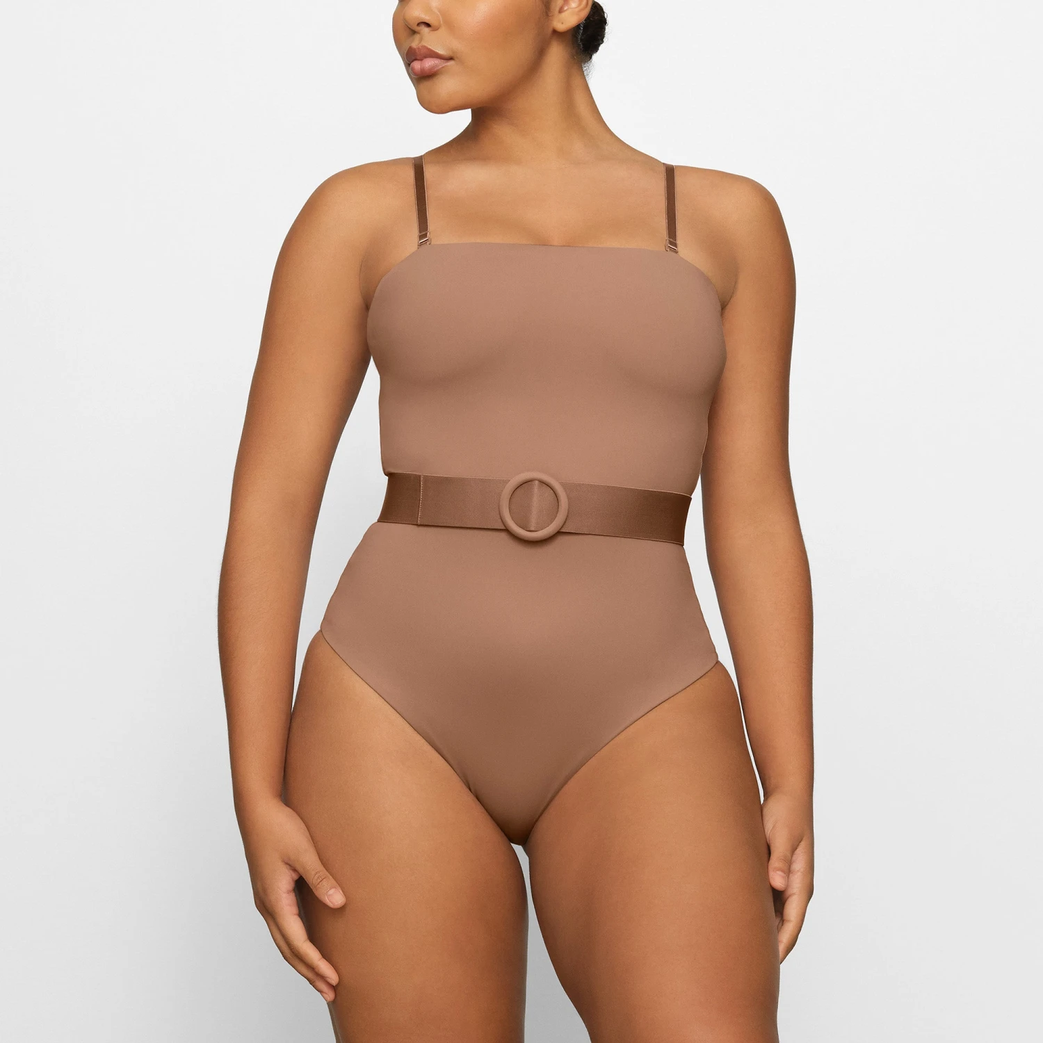 . Features removable straps for extra support and an elastic belt along the waist for a cinching effect. Fits true to size.