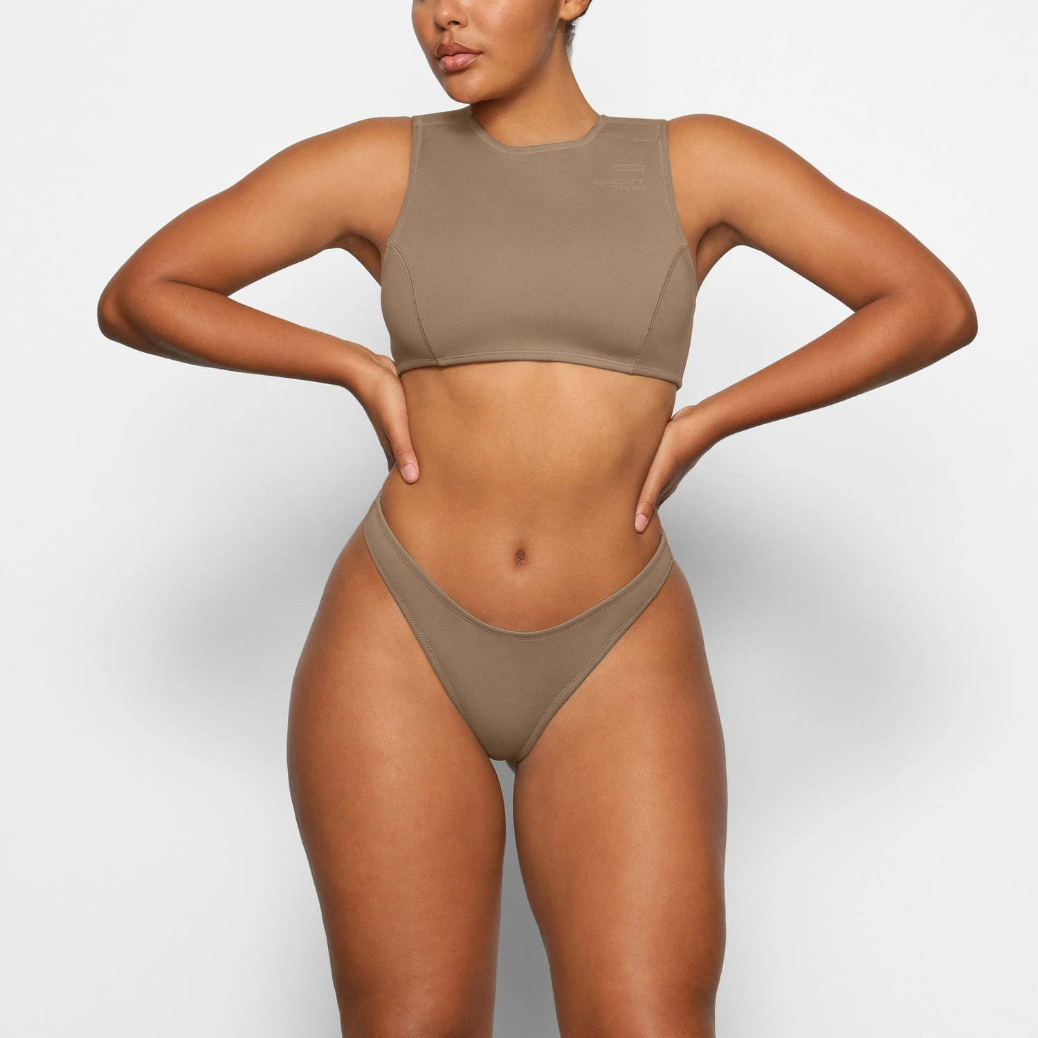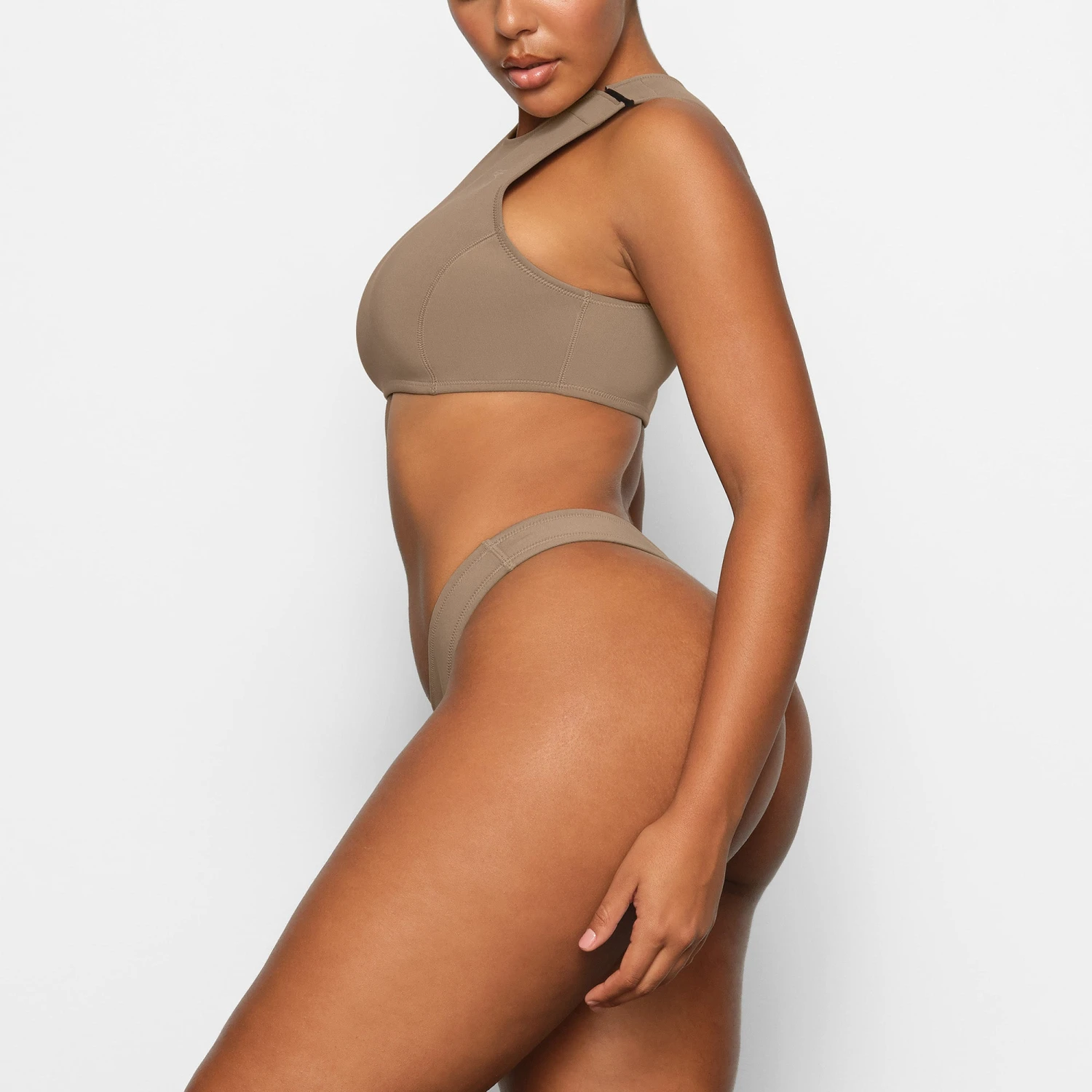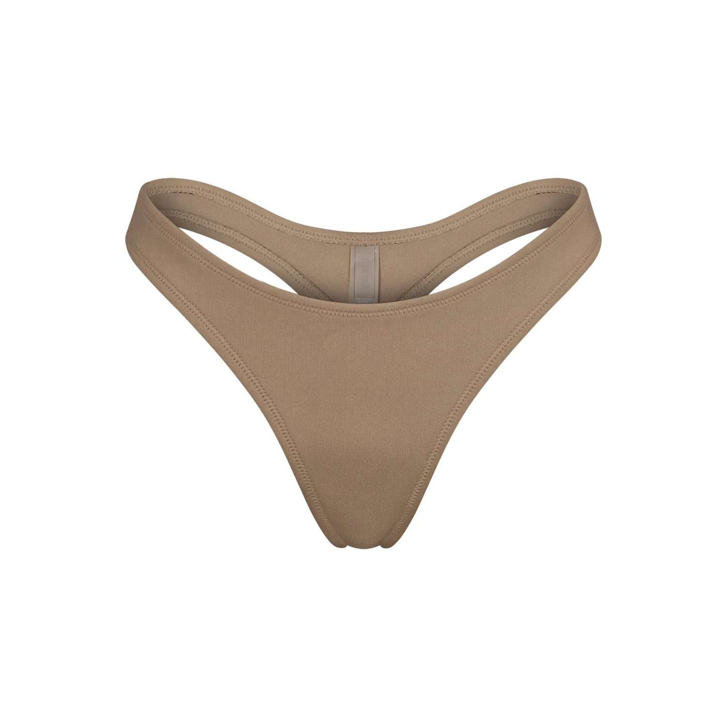 is a chic silhouette with a high-cut leg for an ultra-flattering look. Features minimum coverage and logo details at the back. Fits true to size.