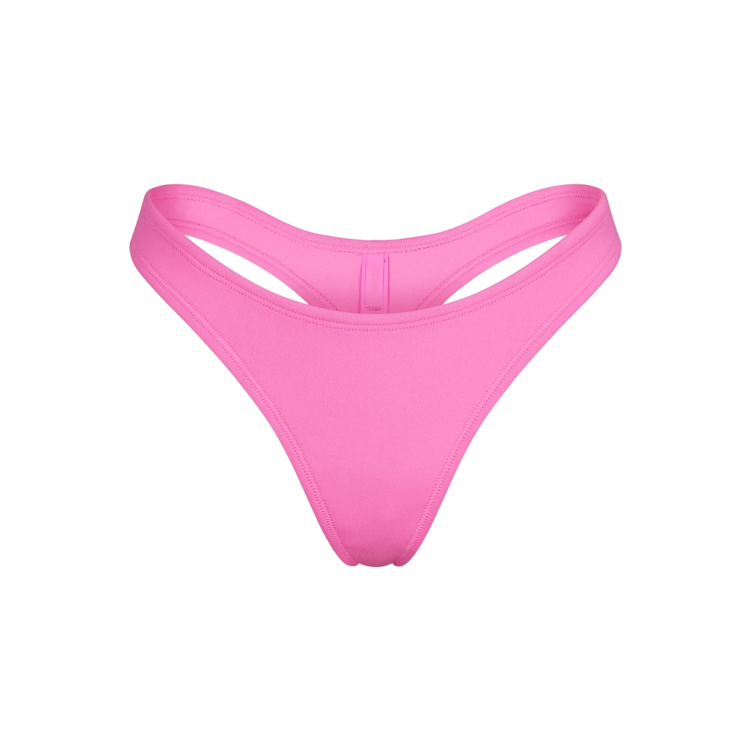 is a chic silhouette with a high-cut leg for an ultra-flattering look. Features minimum coverage and logo details at the back. Fits true to size.
