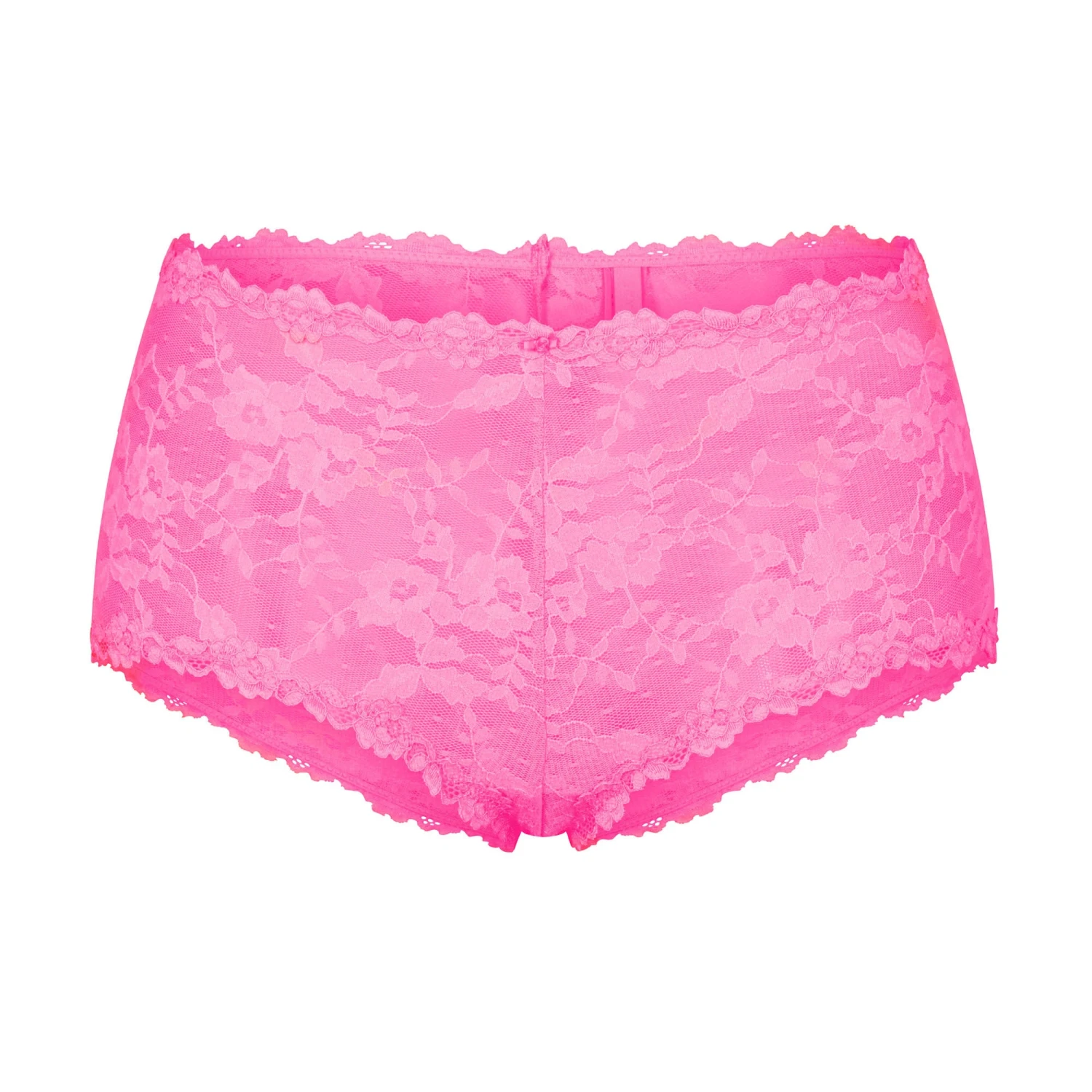 with stretchy all-over lace that complements your curves perfectly. Features a mid-rise fit, lace trim along the waist and leg opening, a rosette detail at the center front, full back coverage, and a cotton gusset. Fits true to size.