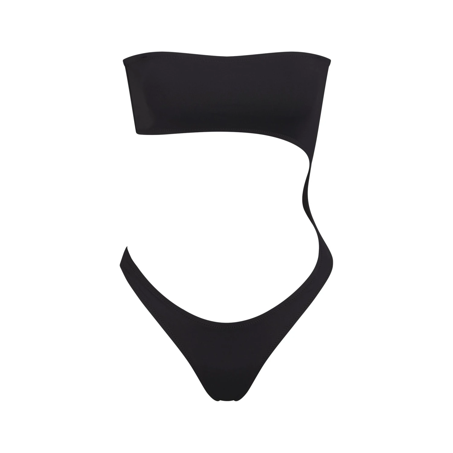 with cheeky coverage and bold cut-out details at the front and back. Features removable adjustable straps. Size up for the best fit.