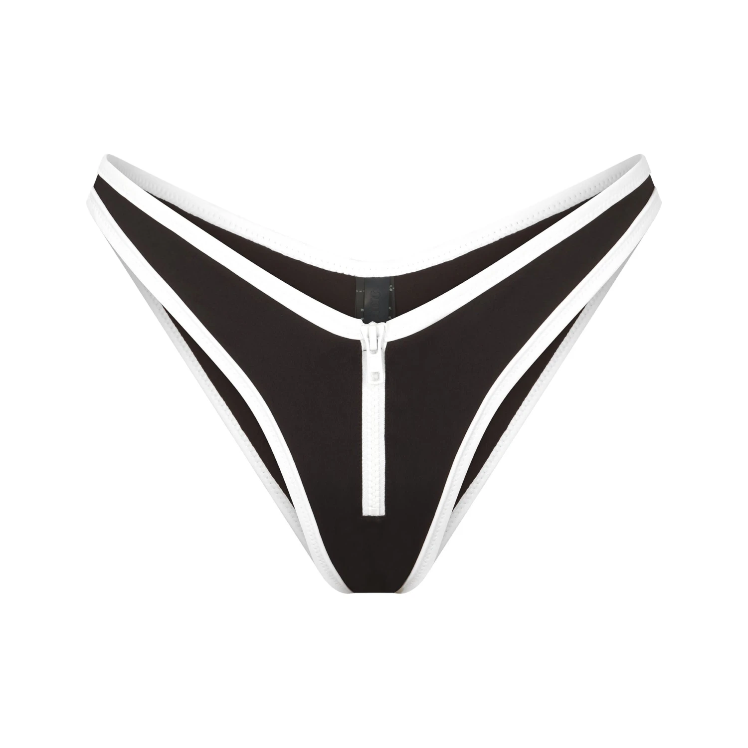 A skimpy dipped swim tanga that hits high on the legs for a flattering look. Features a center front zipper and cheeky back coverage. Make it a set with the coordinating