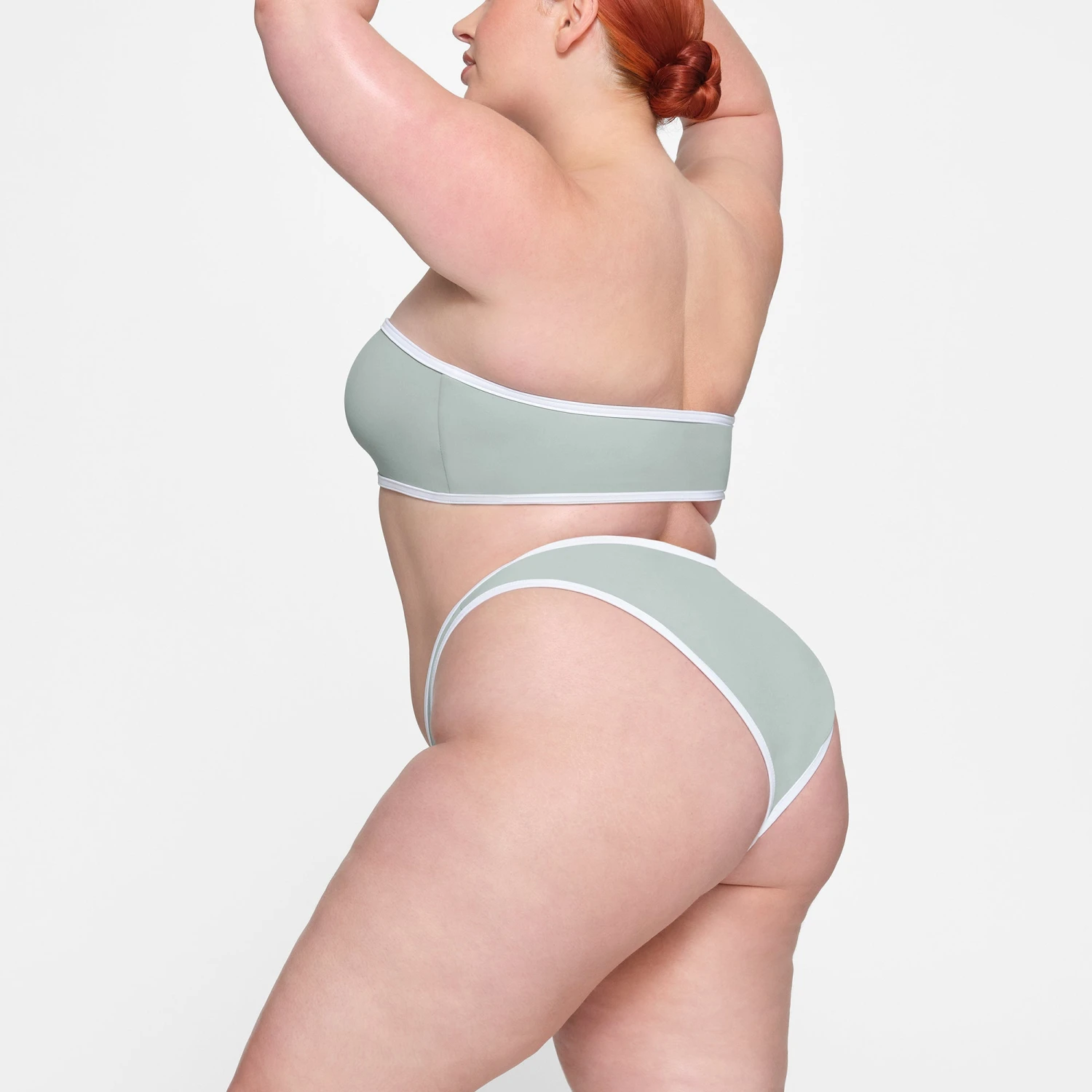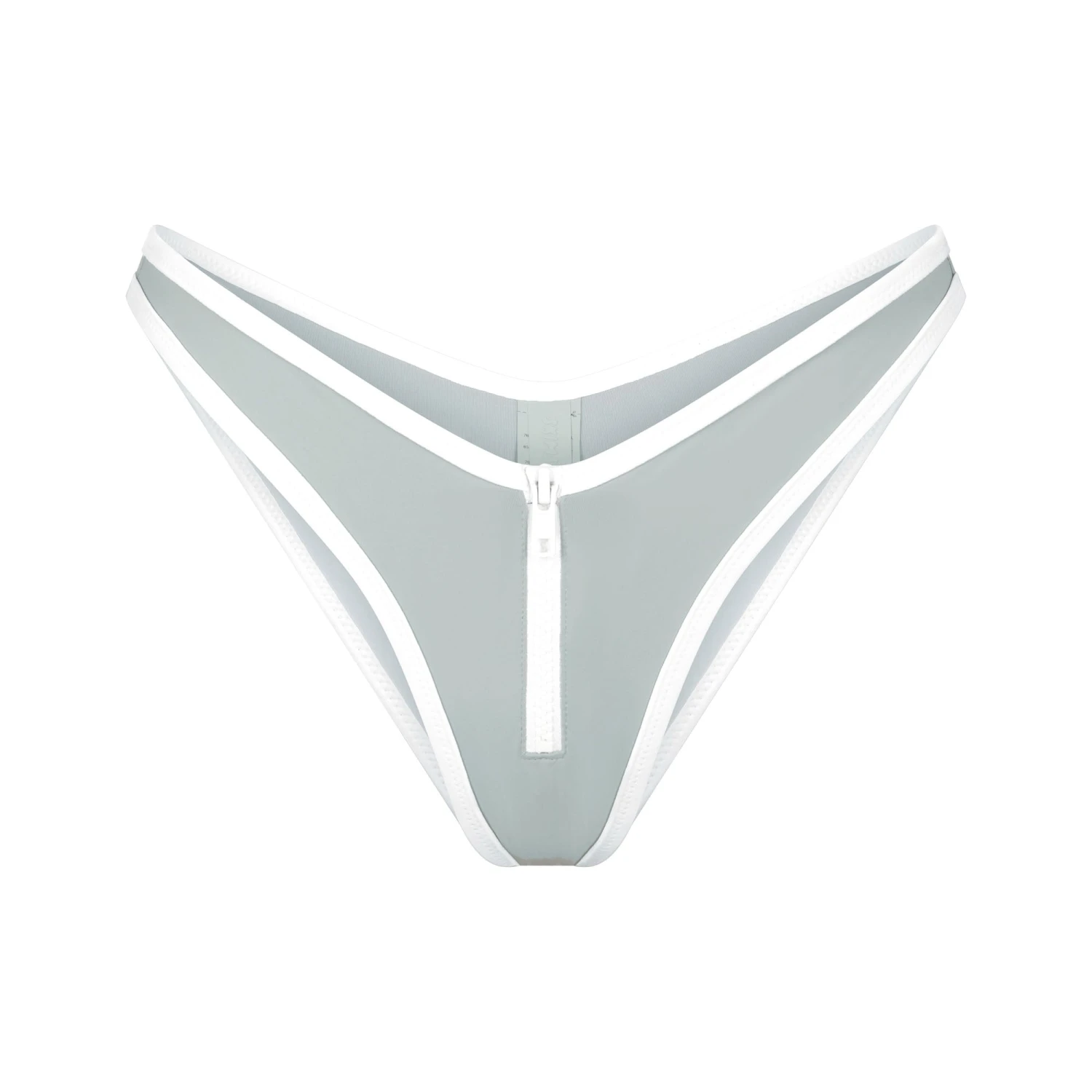 A skimpy dipped swim tanga that hits high on the legs for a flattering look. Features a center front zipper and cheeky back coverage. Make it a set with the coordinating