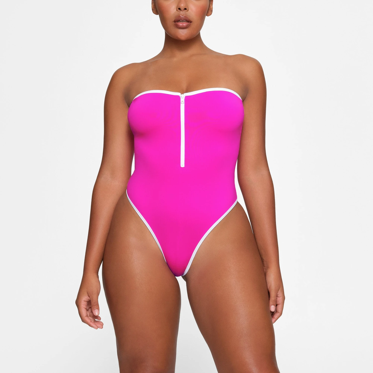 silhouette. Features a brief back with medium coverage and a center front zipper. Fits true to size.
